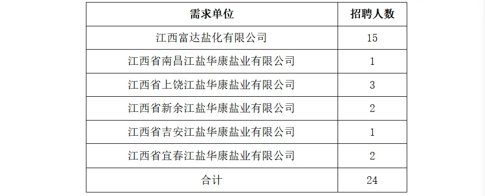 声明:本微信公众号刊载此文,无任何商业目的,纯属公益转发,目的是架起求职者和用人单位之间的桥梁,传递更多的招聘就业信息,请您找工作时候务必高度警惕各类求职陷阱。若来源标注错误或侵犯了您的合法权益,请及时与我们联系,我们将及时更正、删除或依法处理,微信号(含:商务合作):sqdzry。因工作需要,江盐集团盐品事业部所属单位面向校园、社会招聘24名员工,现将招聘事项公告如下。