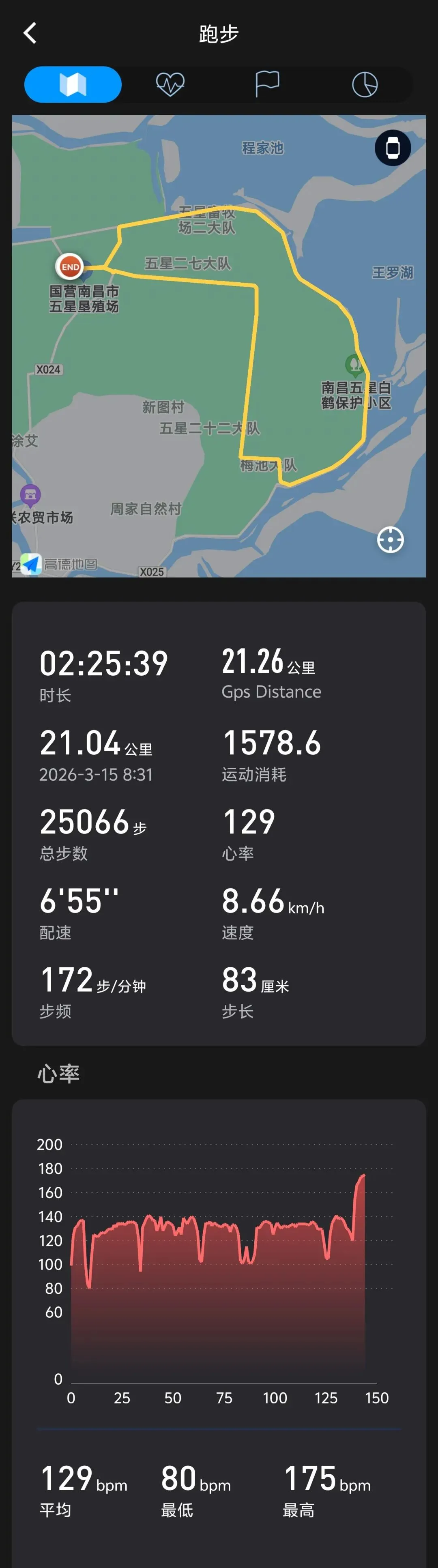 此次半马创造了个人pw(这条赛道其实不好pb的,但也不是那种特别不好跑的赛道。从起步到堤上,沿途就是个很长的小上坡,到了堤上风和太阳都还有点大),全程轻松有氧,最后1.5公里才来了个冲刺。