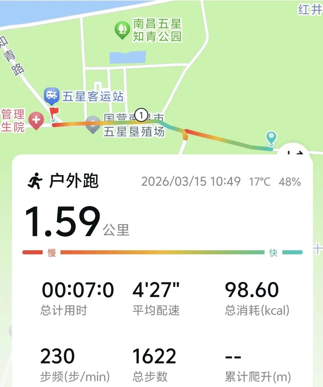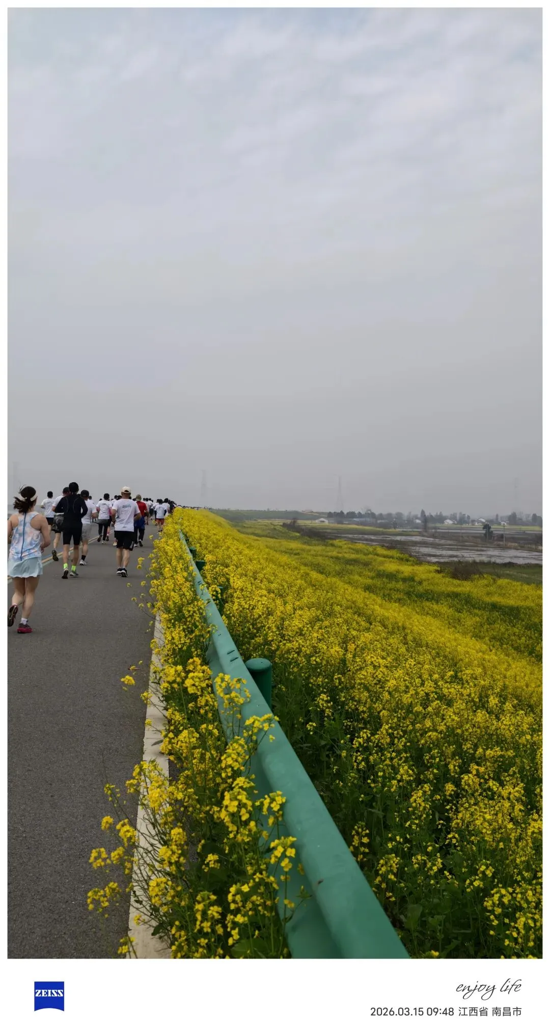最后的冲刺情况如下图,步频肯定是不对的,配速也才4分27。可想而知孝感半马的最后1公里还能冲到4分31的配速真的是要了老命了。 这场比赛让我最大的收获就是体验到了一条充满春天气息的赛道,跑过十里香樟之后就是徜徉在油菜花海。春天就这样不讲道理地涌进每个跑者的眼里和手机镜头里。 此次半马告诉我原来跑马并不需要每次都哼哧哼哧地跑得上气不接下气的,用玩赛的心态去体验一条赛道真的会有另一种不同感受,而且这个赛道也告诉了我一个南昌周末溜娃赏花观鸟的好去处。