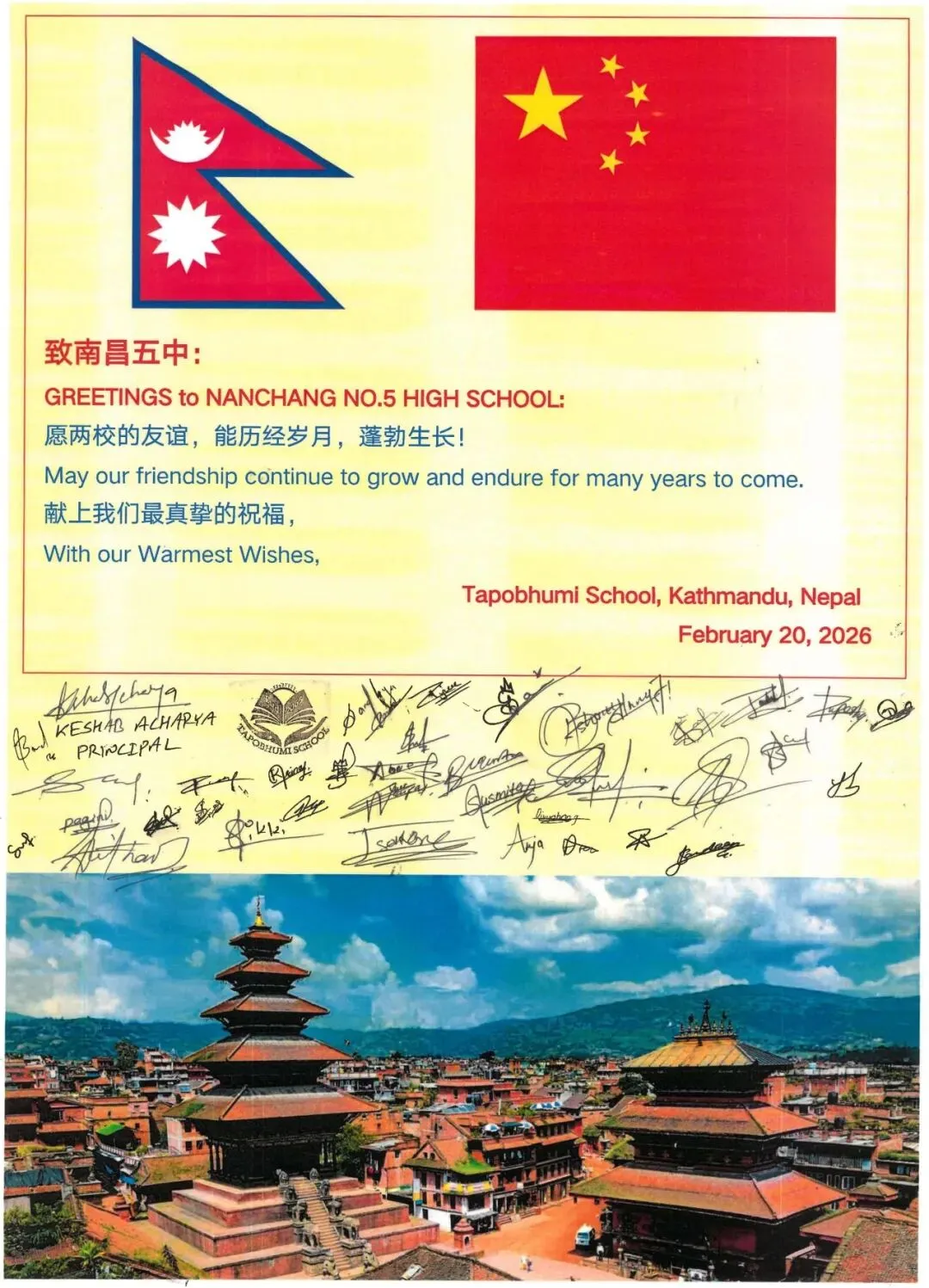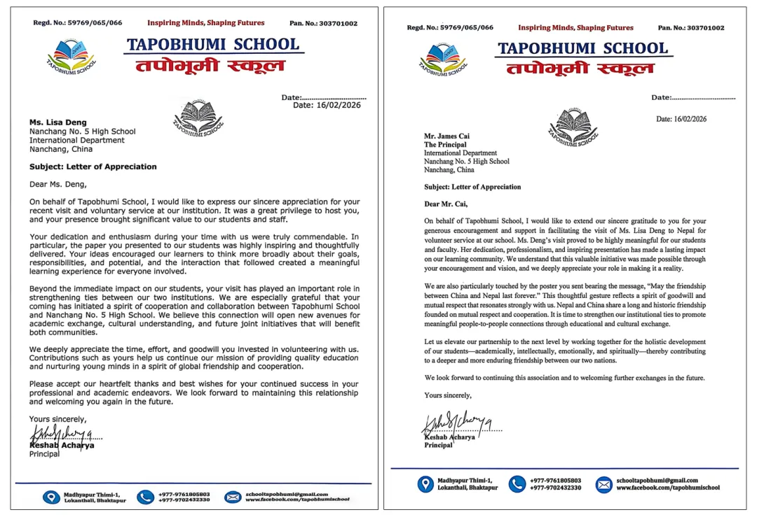 经过10天的辛勤付出与真诚奉献,我收获了Tapobhumi学校校长亲笔书写的感谢信,字里行间满是对我的认可与赞扬;得到了尼泊尔房东的真心相待,他们无微不至的关怀让我在异国他乡感受到了家的温暖;还赢得了学校老师和孩子们的尊重与信任,他们那充满敬意与感激的目光,成为我前行路上最宝贵的动力。