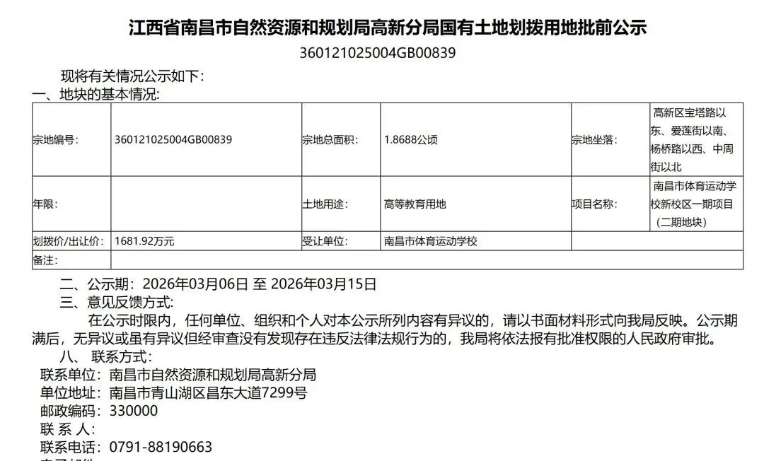 近日,江西省南昌市自然资源和规划局高新分局国有土地划拨用地正式进行了批前公示。