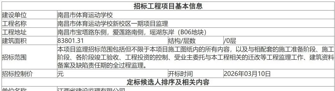 该宗地编号为360121025004GB00839,宗地总面积1.8688公顷,宗地坐落于高新区宝塔路以东、爱莲街以南、杨桥路以西、中周街以北,土地用途为高等教育用地,项目名称为南昌市体育运动学校新校区一期项目(二期地块),划拨价/出让价1681.92万元,受让单位南昌市体育运动学校。除了土地已经获得划拨以外,项目各项招标工作也有了新进展。近日,从江西省公共资源交易网了解到,南昌市体育运动学校新校区一期项目监理招标结果正式公布,定标候选人为江西省建设监理有限公司。另外,项目设计、采购、施工总承包(EPC)招标结果也即将公布。从规划方案看,块用地面积为247987.00平方米,容积率0.29,建筑密度15.56%,绿地率31.85%,总建筑面积为83801.31平方米,其中地上建筑面积为75414.75平方米,地下建筑面积为8386.56平方米,规划机动车停车位地上200辆,地下停车158辆,非机动车位2865。本项目地块内建筑均为新建,主要建设内容共包括两栋四层的教学楼、三栋五层的学生宿舍、一栋两层的食堂、一栋两层的办公楼、一栋四层的图书馆、一栋三层的重竞技馆、一栋一层篮球馆、一栋一层羽毛球馆、一栋两层的乒乓球馆、一栋一层的游泳馆、一栋一层的室内田径馆、一栋一层的船库、地下车库及设备房、门卫、大门、风雨连廊、看台、室外运动场地(400米环形跑道运动场),道路,围墙等配套设施。从区位看,该项目位于南昌市高新区,项目选址为爱莲街以南,宝塔路以东,中周街以北,杨桥路以西。
