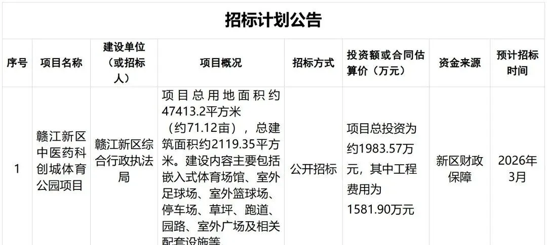 近日,江西省公共资源交易网发布了赣江新区中医药科创城体育公园项目招标计划公告。该项目建设单位为赣江新区综合行政执法局,项目总用地面积约47413.2平方米(约71.12亩),总建筑面积约2119.35平方米。建设内容主要包括嵌入式体育场馆、室外足球场、室外篮球场、停车场、草坪、跑道、园路、室外广场及相关配套设施等。项目总投资为约1983.57万元,其中工程费用为1581.90万元