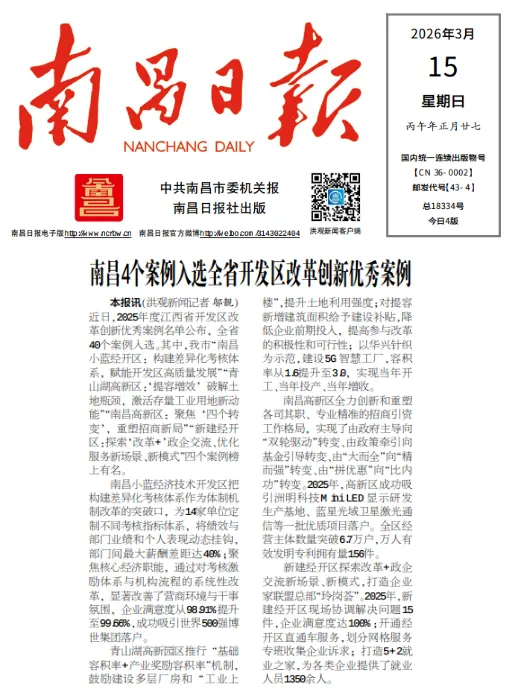 本报讯(洪观新闻记者 邬靓)近日,2025年度江西省开发区改革创新优秀案例名单公布,全省40个案例入选。其中,我市“南昌小蓝经开区:构建差异化考核体系,赋能开发区高质量发展”“青山湖高新区:‘提容增效’破解土地瓶颈,激活存量工业用地新动能”“南昌高新区:聚焦‘四个转变’,重塑招商新局”“新建经开区:探索‘改革+’政企交流、优化服务新场景、新模式”四个案例榜上有名。