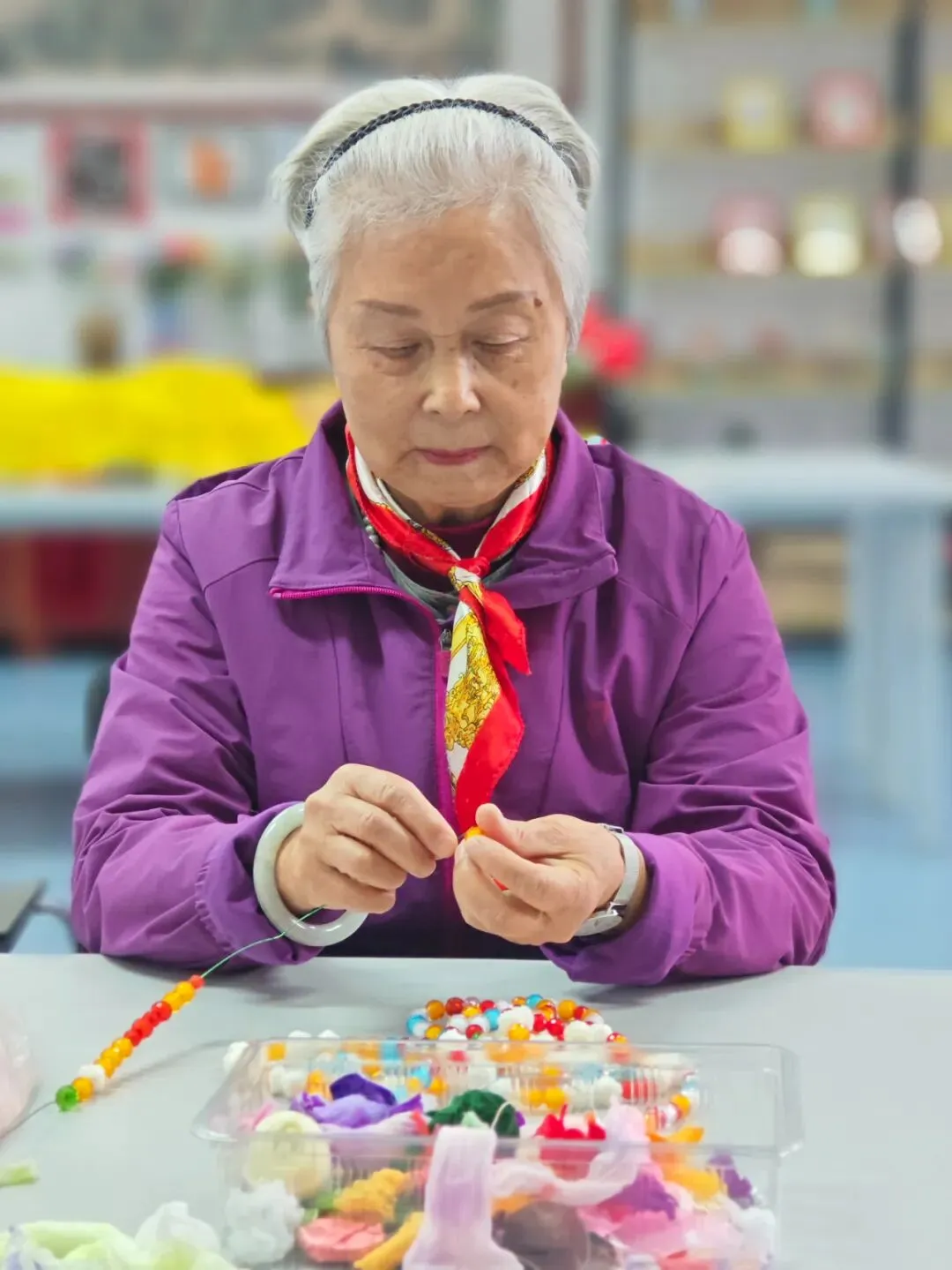 银发上缀着自己做的花,耳垂下晃着自己串的珠,胸前彩链轻轻摇曳,像一盏盏小灯笼,晃出一串串指尖捻过的欢喜。