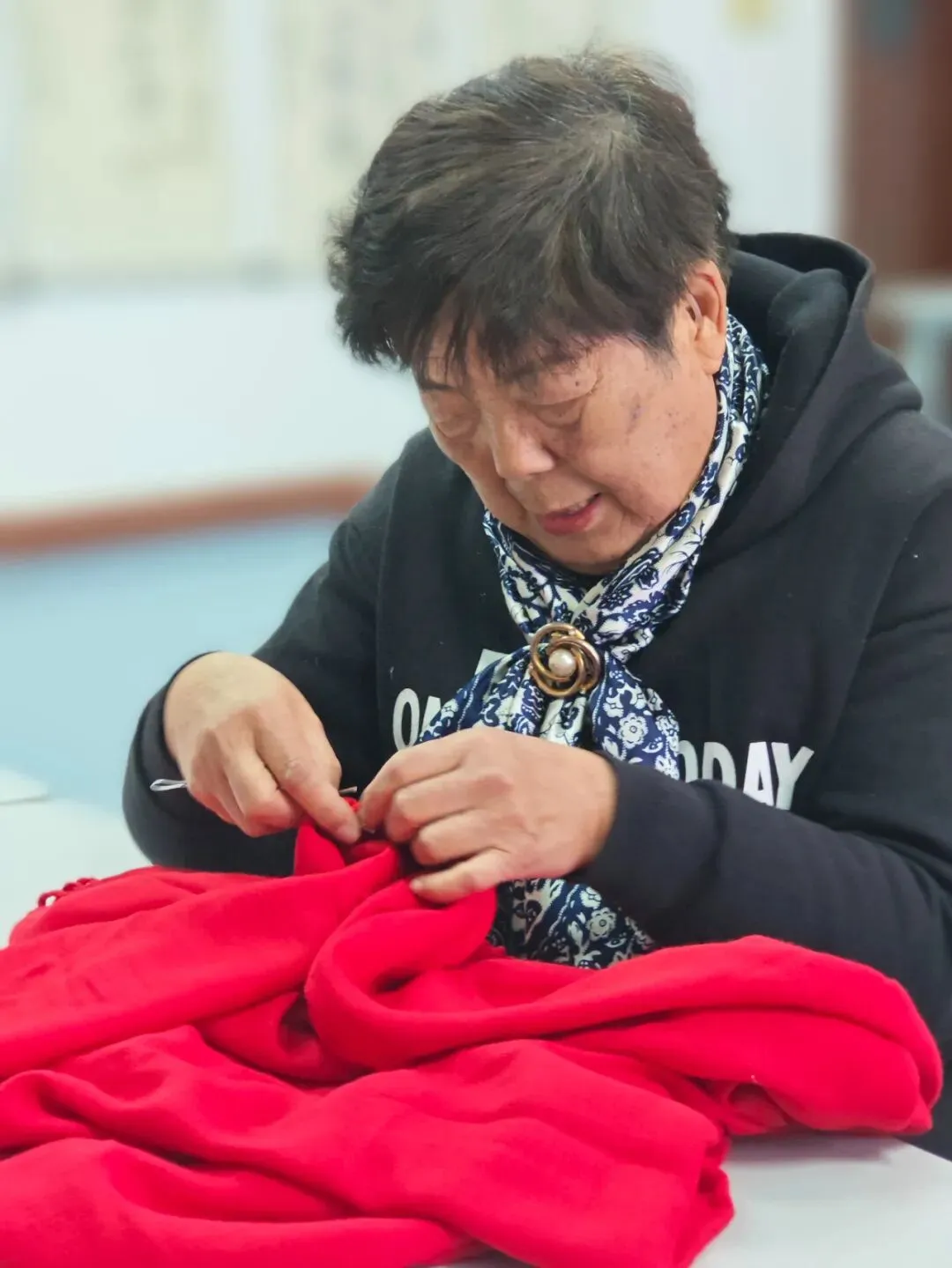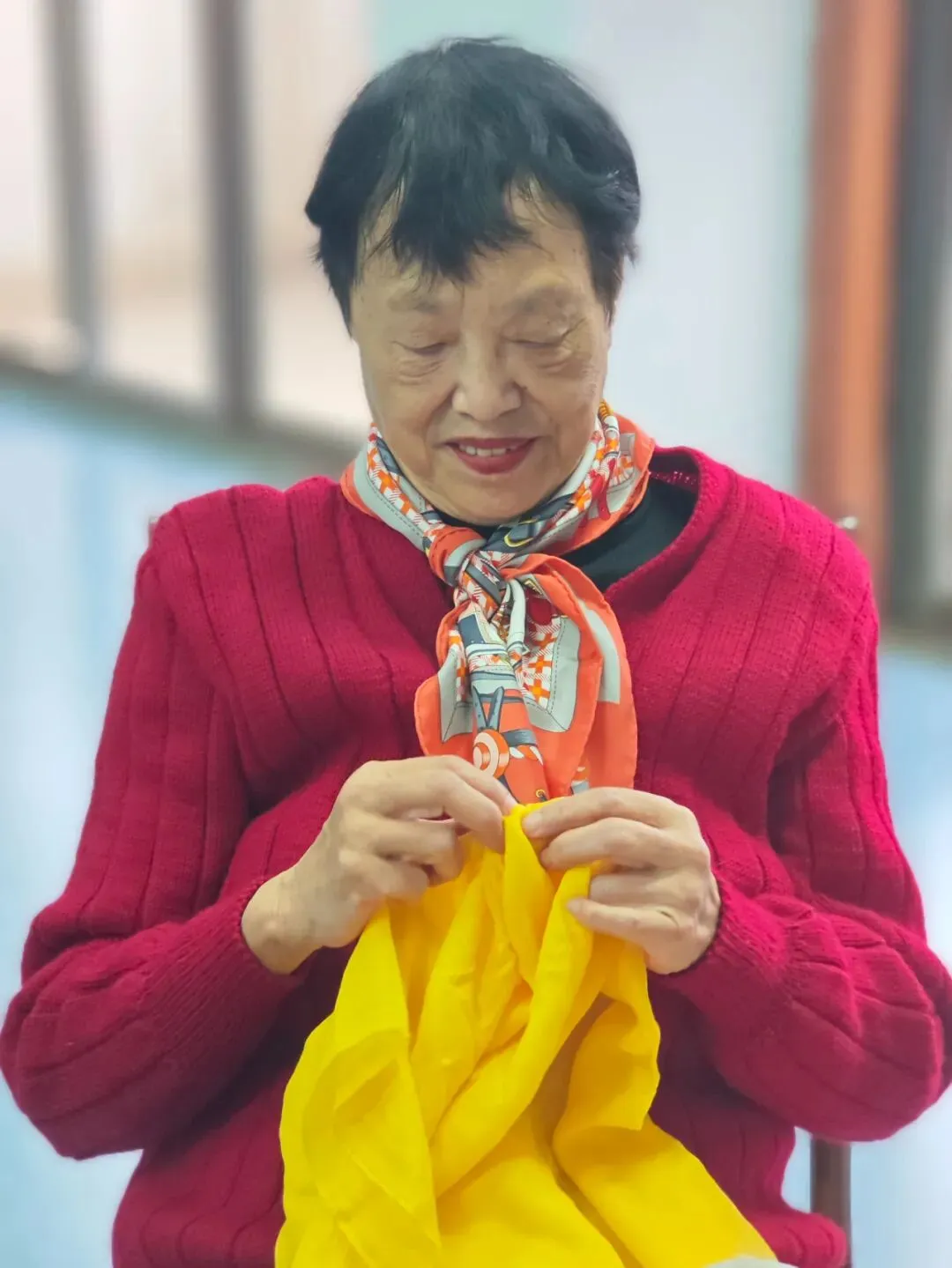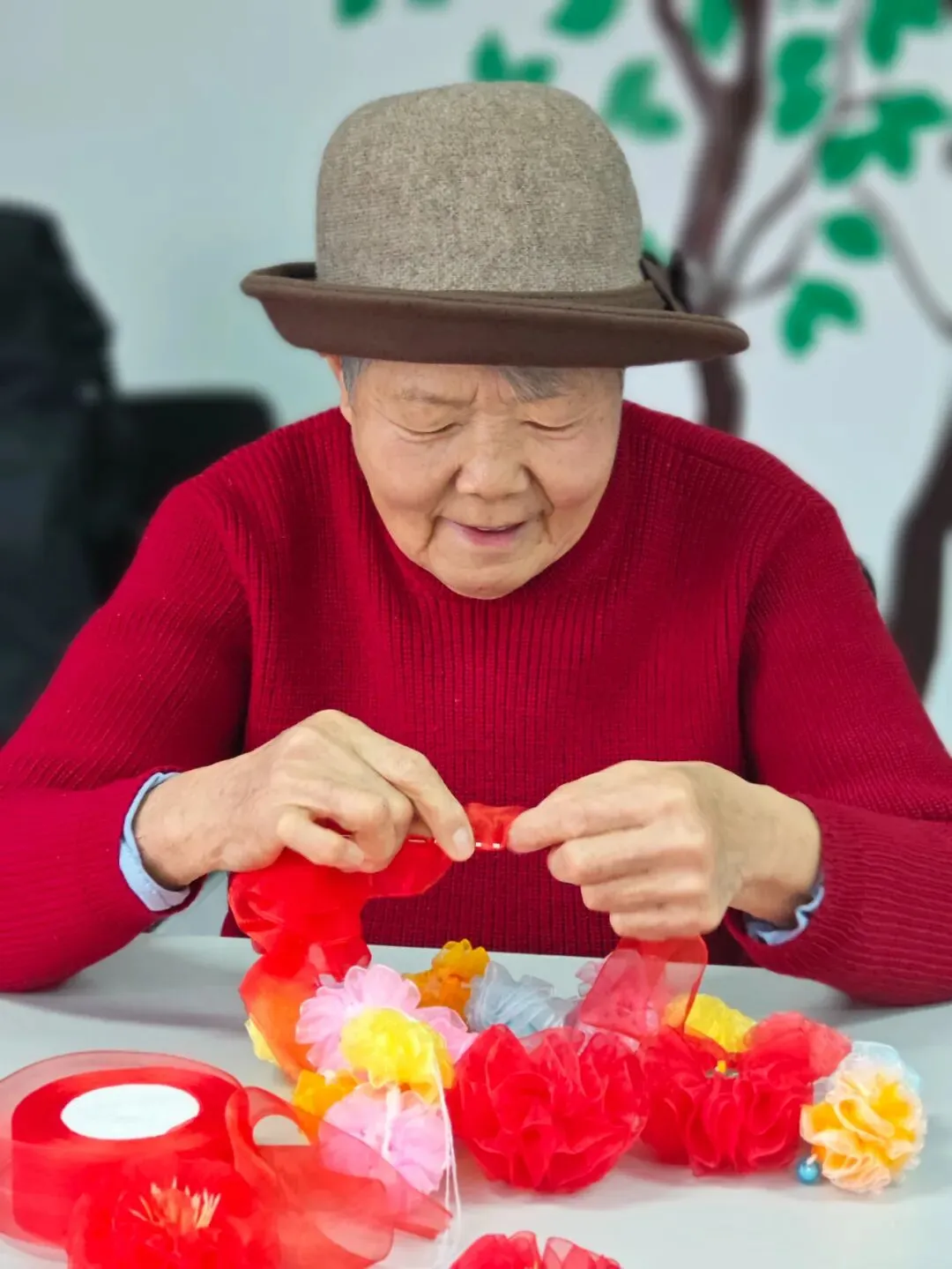 奶奶们的装扮是独属于晚年的浪漫——为了展示最美的自己,奶奶们化身“手工艺术家”,亲手制作起自己的表演服,指尖翻飞间,一朵朵绢花连成了发间点缀,彩珠串成了珠链,还有更绝的——两条红围巾一拼,就成了吸睛的亮眼红裤!一身装扮明艳又俏皮,全是“亲手打造”的骄傲。