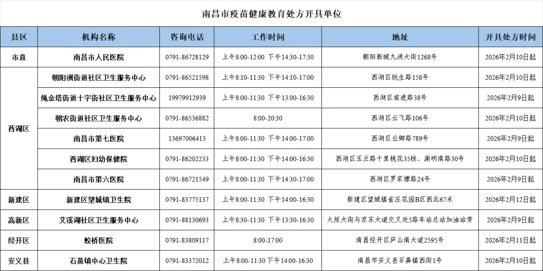 为进一步提升全生命周期健康服务的内涵和质量,强化疾控机构和医疗机构业务工作协同,结合南昌市实际,从2026年2月9日起至10月31日在全市各相关医疗机构开展“疫苗健康教育处方”试点工作,按照试点单位的指引完成相应疫苗接种等流程,可免除相应剂次预防接种服务费。