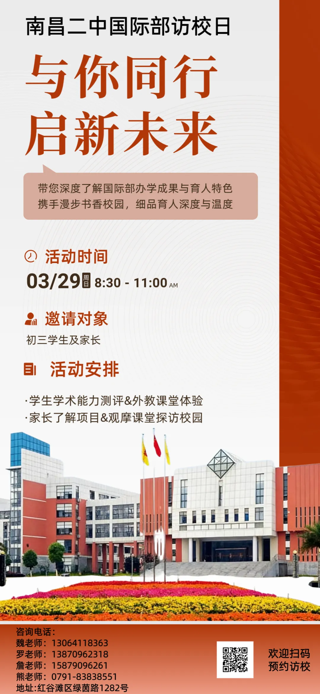 自上学期多场访校日活动成功举行后,南昌二中国际部咨询热线持续热络,学生家长热情空前高涨。考虑到众多学生家长深度交流的热切需求,我部本学期定于3月29日上午再度开展访校日活动。让我们携手漫步书香校园,亲历创新课堂风采,细品育人温度。具体信息如下: