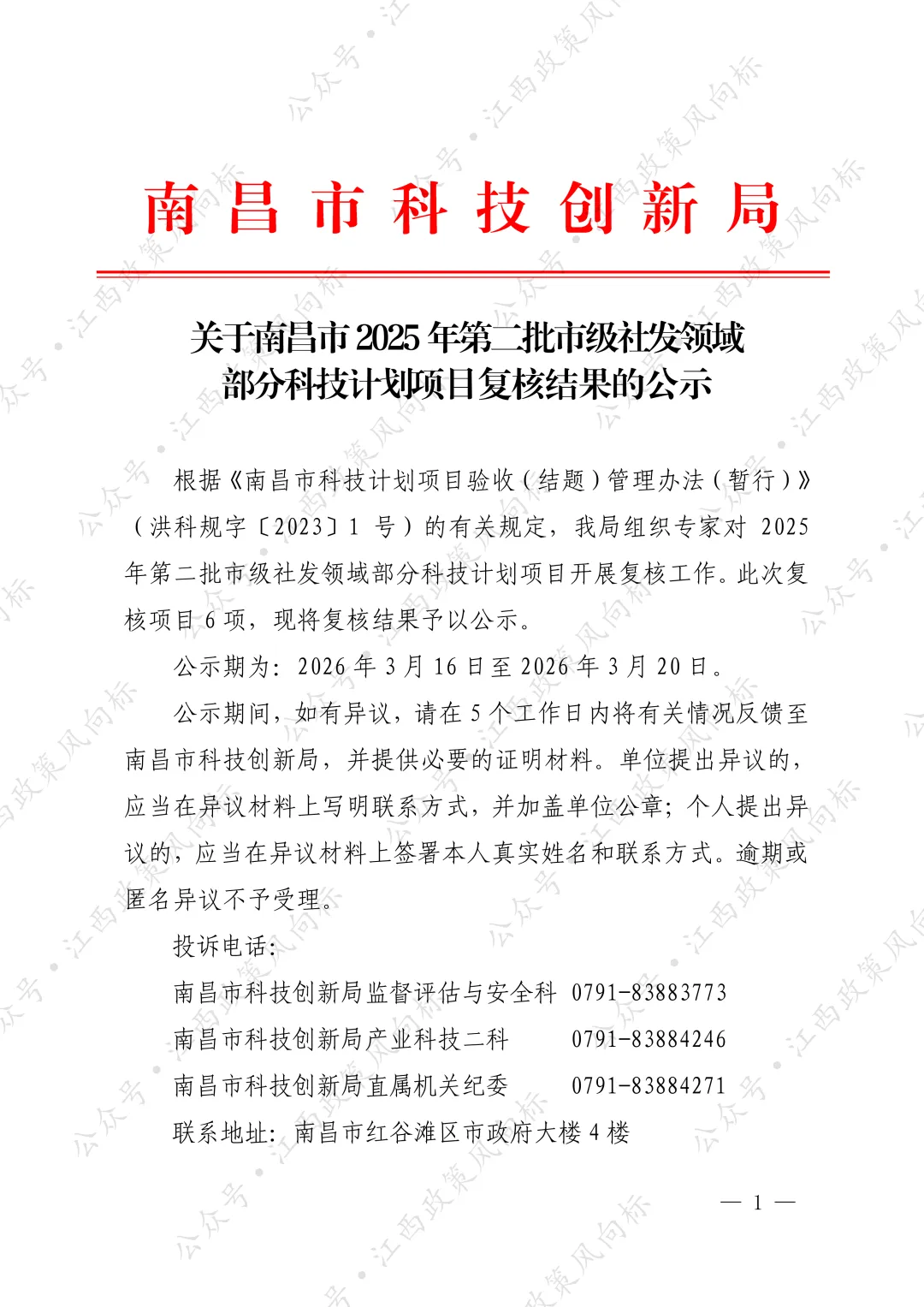 根据《南昌市科技计划项目验收(结题)管理办法(暂行)》(洪科规字〔2023〕1号)的有关规定,我局组织专家对2025年第二批市级社发领域部分科技计划项目开展复核工作。此次复核项目6项,现将复核结果予以公示。
