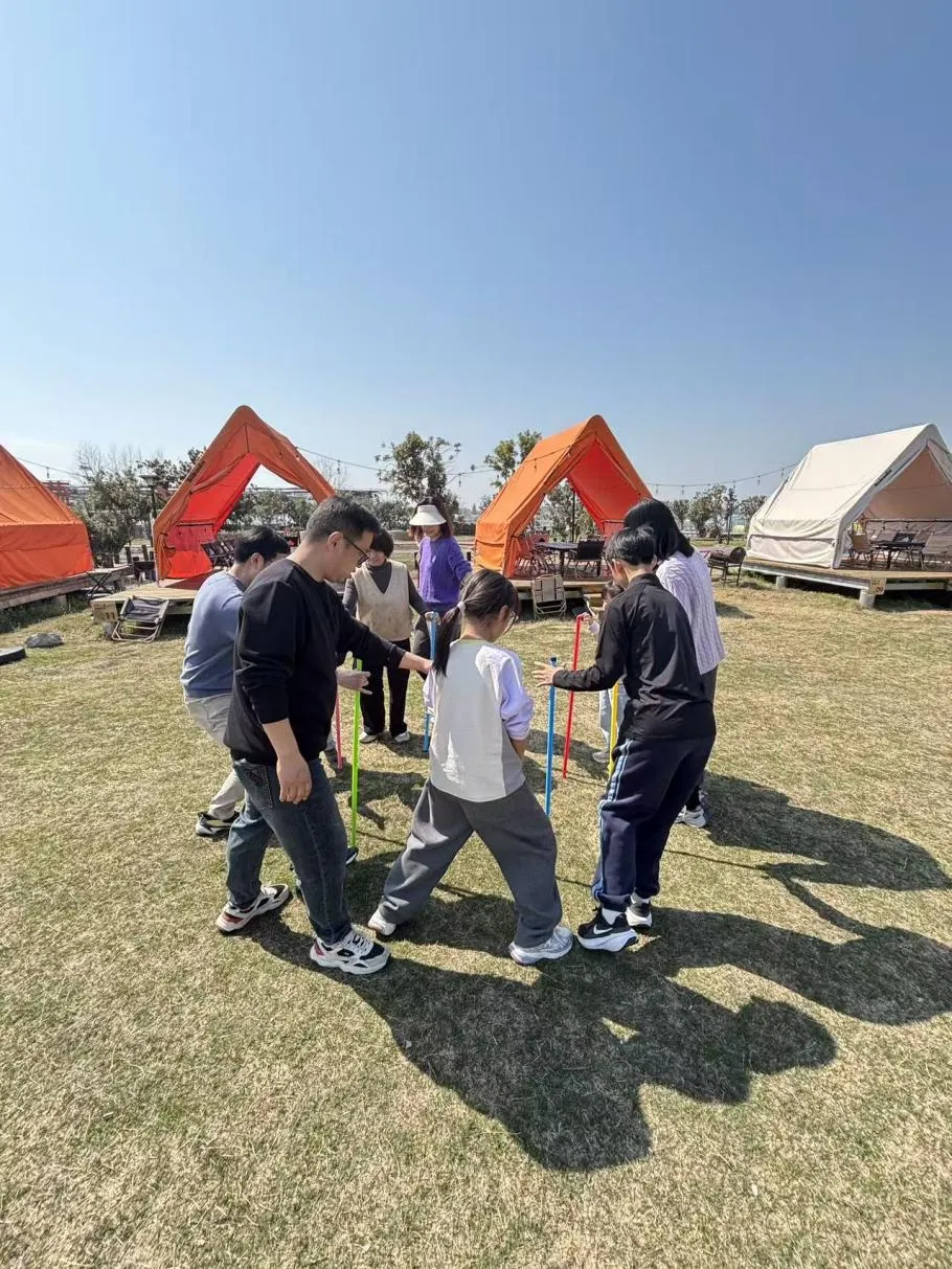 教职工们准时集合出发,抵达营地后,开营仪式顺利开启,随即开展有趣的户外拓展活动。户外拓展环节精彩纷呈,不倒森林、拔河、乡村毛毛虫竞速等拓展项目依次开展,各小组团结协作、默契配合,赛场之上呐喊欢笑声不断,充分展现出凝心聚力的团队精神。