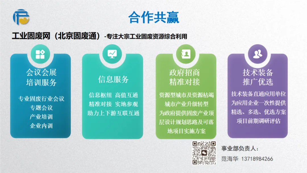 会议会员事业部:大宗固废全产业链信息服务,包括煤矸石、粉煤灰、工业副产石膏、钢铁冶金渣、有色冶炼渣、赤泥、建筑垃圾等大宗工业固废综合利用信息集成、宣传推广、会议培训、科技成果转化、项目参观考察、区域工业固废精准招商会议等,专业负责煤矸石、粉煤灰、工业副产石膏、钢铁冶金渣、有色冶炼渣、赤泥、建筑垃圾等大宗工业固废固废管家咨询服务+固废综合利用技术解决方案+固废综合利用技术选型方案+固废产业规划询,面向行业提供工业固废综合利用科技技术成果转化等。深度提供工业固废产业政策,洞悉产业走向,服务矿山、能源等固废企业。