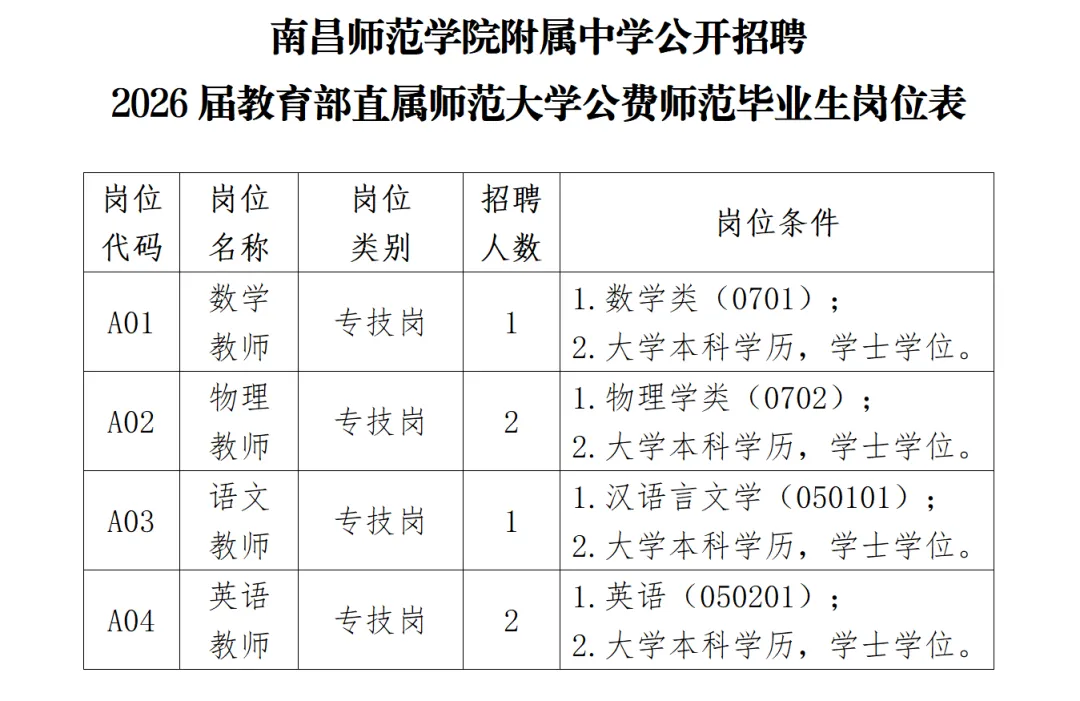 招聘计划共6名。具体招聘岗位及要求详见《南昌师范学院附属中学公开招聘2026届教育部直属师范大学公费师范毕业生岗位表》(附件1,以下简称《岗位表》)。