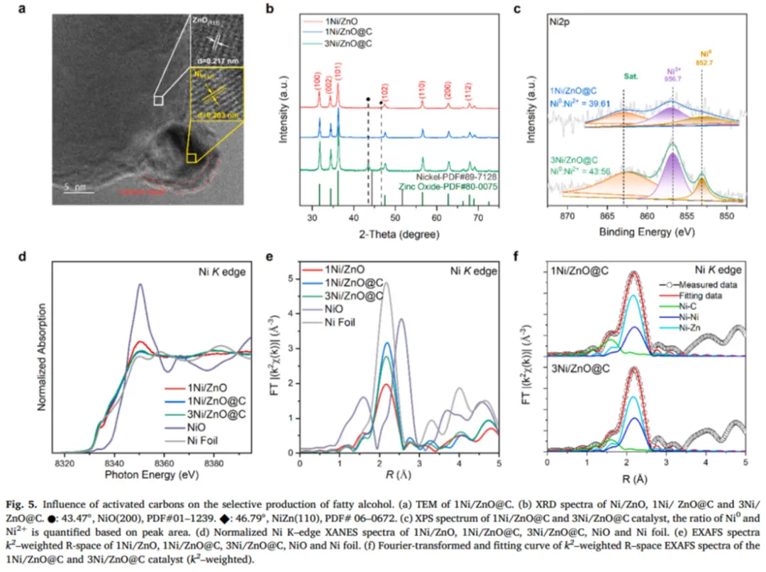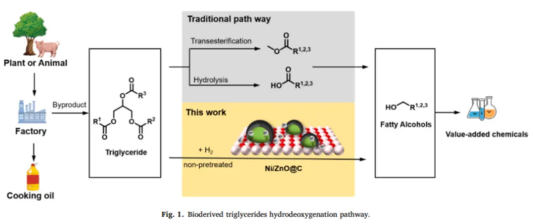 将不可食用的甘油三酯(如废弃油脂、椰子油、棕榈油等)转化为高价值化学品,是可持续化学领域的一个关键研究方向。然而,由于其分子结构复杂且含有惰性COO-R键,不经过预处理的情况下直接转化甘油三脂选择性地制备长链脂肪醇并抑制过度氢化,仍具有挑战性。本文通过将Ni纳米颗粒沉积到ZnO上,并掺杂活性炭,制备了一种镍基(Ni/ZnO@C)催化剂。该催化剂在甘油三脂的加氢脱氧方面表现出高催化活性,并可高选择性制备相应的脂肪醇。这种对脂肪醇的高选择性是通过掺杂碳调控催化界面以暴露更多Ni-ZnO活性位点从而促进氢气异裂实现的。并且碳掺杂提高电子转移效率,此外可以有效减少Ni流失,显著改善并提高催化剂的稳定性和循环性。这种创新性的催化系统能够将自然界的油品直接转化为脂肪醇,具有巨大的工业应用潜力,并为未来理性催化剂设计提供了宝贵的战略。