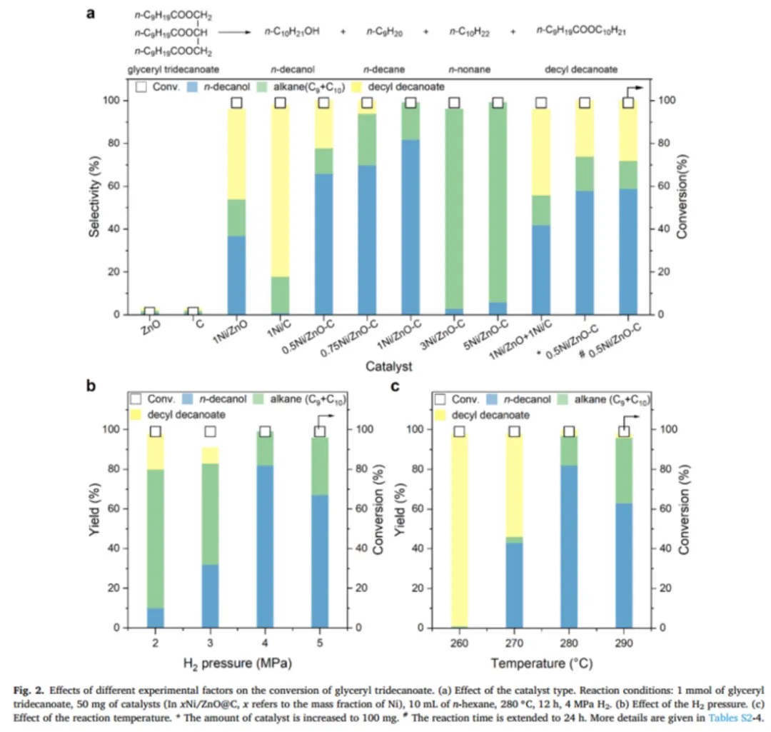 作者以三癸酸甘油酯为模型化合物进行了催化剂筛选,发现碳的掺杂可以显著提高催化活性并改变产物分配。此外,考察了Ni负载量和氢气压力对反应的影响。在最佳反应条件(280 ℃,4 MPa H2)下,1Ni/ZnO@C催化甘油三酯以82%的产率生成脂肪醇。