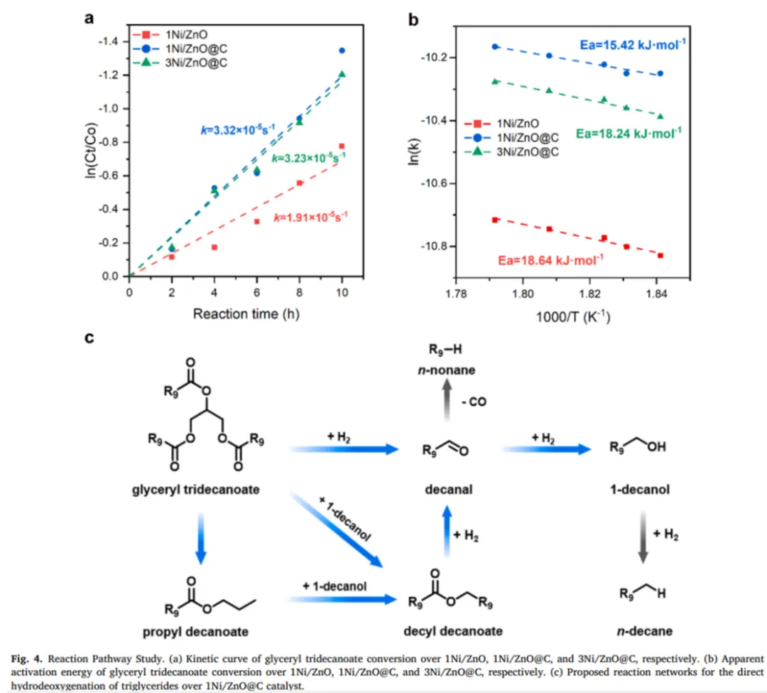 接下来作者对三癸酸甘油酯在xNi/ZnO@C上的转化展开了详细的反应路径研究。对比了甘油三酯在1Ni/ZnO、1Ni/ZNO@C和3Ni/ZNO@C催化剂上转化的反应速率与表观活化能。建立了甘油三脂在催化剂上的直接加氢脱氧反应路径网格。