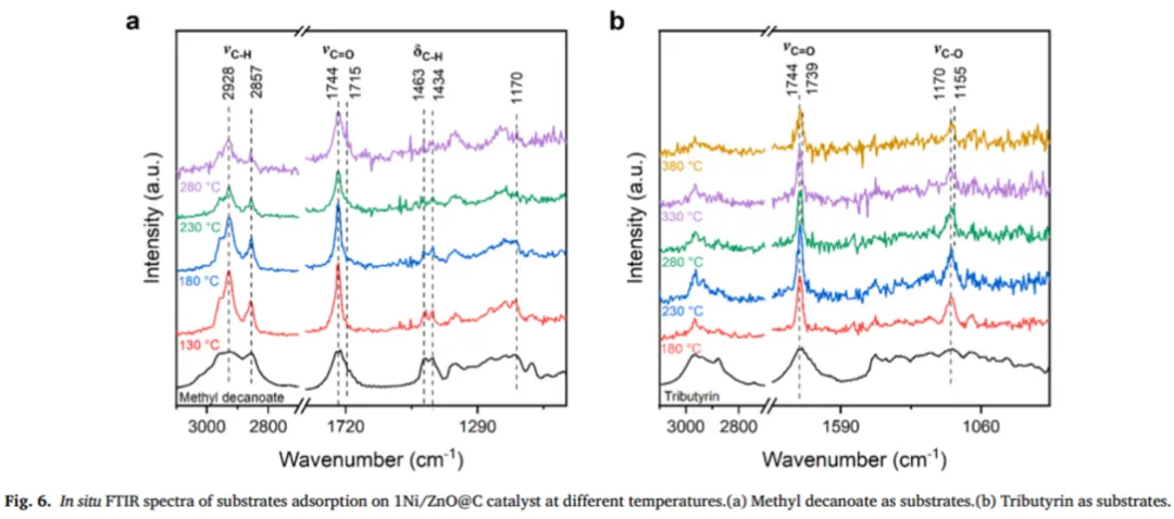 作者通过原位红外对比了癸酸甲酯和三丁酸甘油酯在1Ni/ZnO@C的转化过程。发现两种模型分子作为底物的不同之处在于,甘油三脂在1Ni/ZnO@C上的化学吸附能力比脂肪酸甲酯的化学吸附能力强。这可以归因于碳层的引入,增加了催化剂和甘油三酯之间的接触表面积。然而,这种相互作用在较高温度(>300 ℃)下将被减弱。