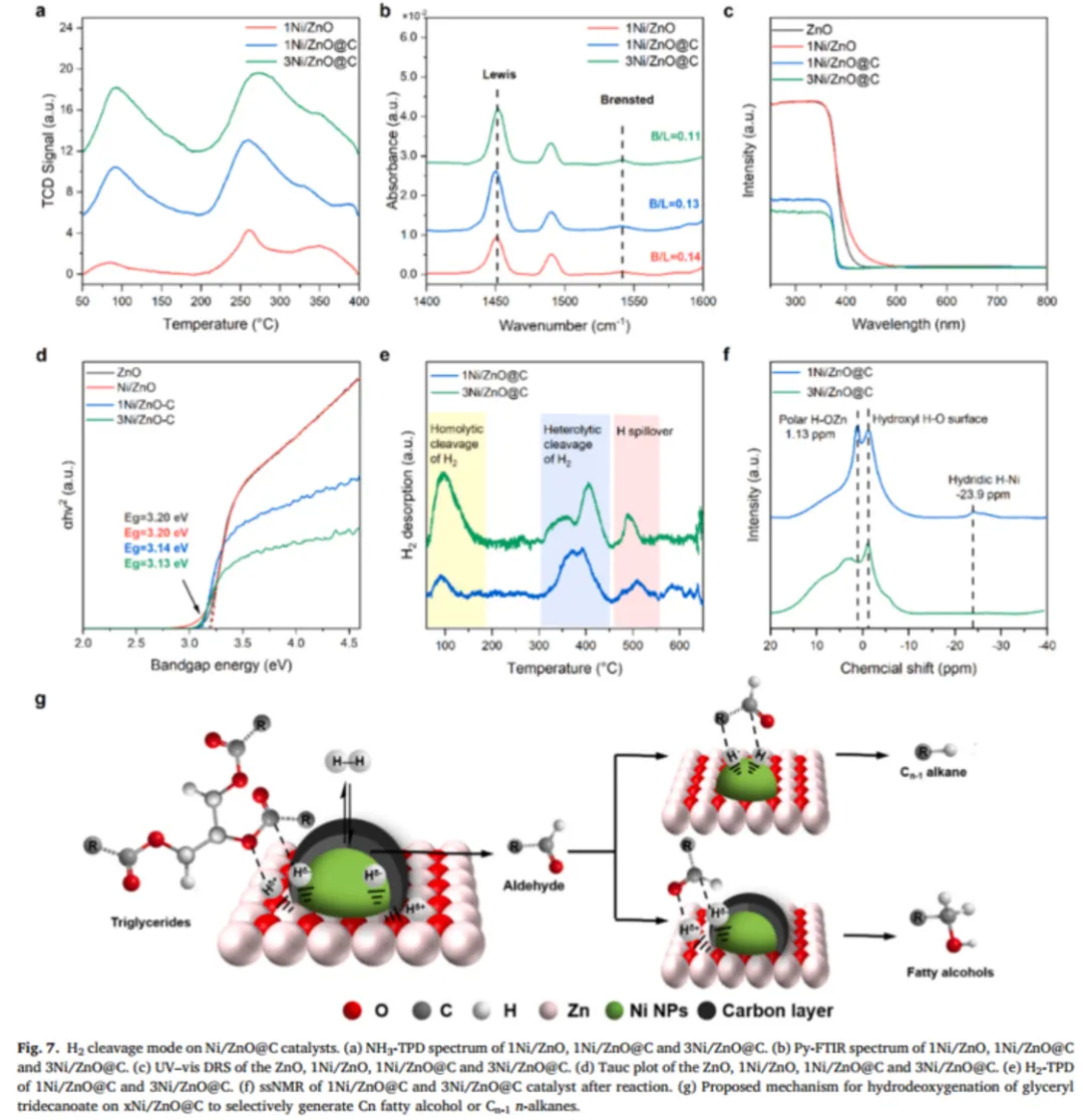 作者通过NH3-TPD以确定催化剂表面上酸性位点的强度,发现1Ni/ZnO以中等酸性中心为主,而1Ni/ZnO@C和3Ni/ZnO@催化剂表面的中酸中心主要来自Ni物种,碳的加入使催化剂表面的弱酸中心增加。py-FTIR光谱证实,1Ni/ZnO@C和3Ni/ZnO@C比1Ni/ZnO表现出更多的路易斯酸性位点。这可以解释1Ni/ZnO@C和3Ni/ZnO@C的催化性能优于1Ni/ZnO。作者使用漫反射光谱(UV-vis DRS)测定了ZnO载体催化剂的带隙,并使用Tauc图描述(αhν)2和hν之间的关系,空白ZnO和1Ni/ZnO的估计带隙约为3.20 eV,表明Ni仅存在于催化剂表面,不影响ZnO的带隙。然而,1Ni/ZnO@C的带隙能量(~3.14 eV)和3Ni/ZnO@C(~3.13 eV)的带隙能量略微降低(图7 d),表明ZnO晶格中存在C或Ni,这有助于电子转移,促进电荷载流子的局域化并影响能带弯曲和界面空间电荷。这倾向于隔离电子和质子,从而促进H2异裂为Hδ+和Hδ−。此外通过H2-TPD和ssNMR表征共同验证H2在1Ni/ZNO@C和3Ni/ZNO@C上的裂解差异性。最终提出了甘油三脂在两种催化剂上可能的反应机理。