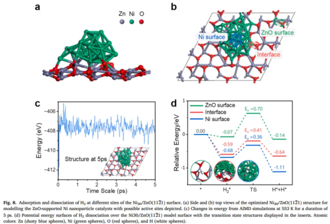 作者通过将一个中等大小的Ni30团簇(优化的颗粒尺寸为1 nm)在ZnO基底表面上来构建催化剂模型(模型在反应温度下保持稳定),在不同反应位点处的H2解离的势能表面和优化的吸附结构如图所示。 计算结果表明,Ni-ZnO界面和Ni NP表面有利于H2解离,与实验结果一致。在含有高分散Ni NP的催化剂中,Hδ+/Hδ−吸附物可以聚集在Ni-ZnO界面,并作为底物加氢生成脂肪醇的活性物种;此外,随着Ni NPs粒径的增大,导致形成带负电荷的Hδ−吸附物聚集,并改变从脂肪醇形成到脂肪烷烃形成的反应途径。