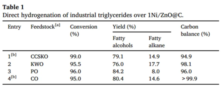 作者尝试使用工业粗甘油三酯作为底物,以验证甘油三酯直接加氢脱氧制备脂肪醇的可行性。结果如表1所示,樟树籽油(CCSKO)、厨余油(KWO)、棕榈油(PO)和椰子油(CO),在1Ni/ZnO@C催化剂上可以获得不错的脂肪醇收率。展现出巨大的工业应用潜力。