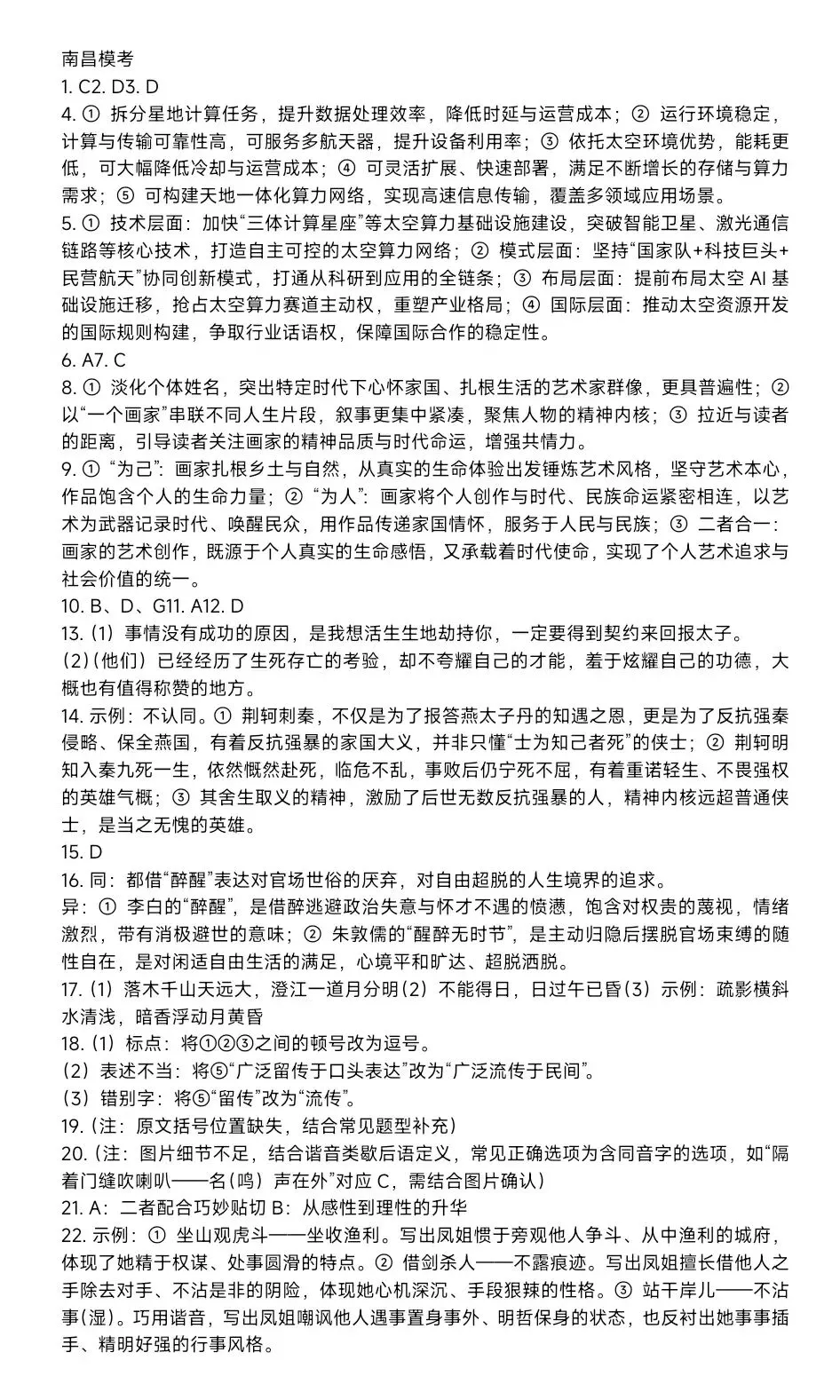 8.① 淡化个体姓名,突出特定时代下心怀家国、扎根生活的艺术家群像,更具普遍性:②以“一个画家”串联不同人生片段,叙事更集中紧凑,聚焦人物的精神内核;③ 拉近与读者的距离,引导读者关注画家的精神品质与时代命运,增强共情力。9.①“为己:画家扎根乡土与自然,从真实的生命体验出发锤炼艺术风格,坚守艺术本心作品饱含个顢威人的生命力量:②“为人:画家将个人创作与时代、民族命运紧密相连,以艺术为武器记录时代、唤醒民众,用作品传递家国情怀,服务于人民与民族:③ 二者合一:画家的艺术创作,既源于个人真实的生命感悟,又承载着时代使命,实现了个人艺术追求与社会价值的统一。10.B、D、G11.A12.D13.(1)事情没有成功的原因,是我想活生生地劫持你,一定要得到契约来回报太子。(2)(他们)獅已经经历了生死存亡的考验,却不夸耀自己的才能,羞于炫耀自己的功德,大概也有值得称赞的地方。14.示例:不认同。① 荆轲刺秦,不仅是为了报答燕太子丹的知遇之恩,更是为了反抗强秦侵略、保全燕国,有着反抗强暴的家国大义,并非只懂“士为知已者死”的侠士;② 荆轲明知入秦九死一生,依然慨然赴死,临危不乱,事败后仍宁死不屈,有着重诺轻生、不畏强权的英雄气概:③ 其舍生取义的精神,激励了后世无数反抗强暴的人,精神内核远超普通侠士,是当之无愧的英雄。15.D