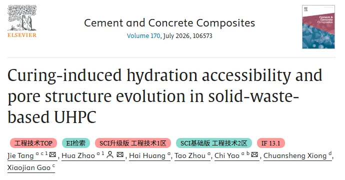 超高性能混凝土(UHPC)凭借超高强度、高耐久性成为高端基建关键材料,但高熟料用量与高能耗生产与低碳发展目标相悖。将锂渣、钢渣、玻璃粉等工业固废引入 UHPC,可大幅降低水泥用量与碳排放,然而固废自身成分不均,叠加 UHPC 极低水胶比特性,导致体系对养护制度极度敏感。养护不仅影响水化进程,更主导反应可及性、凝胶生成与孔结构重分布,但其内在耦合机制尚未明确,严重制约固废基 UHPC 的稳定制备与工程应用。