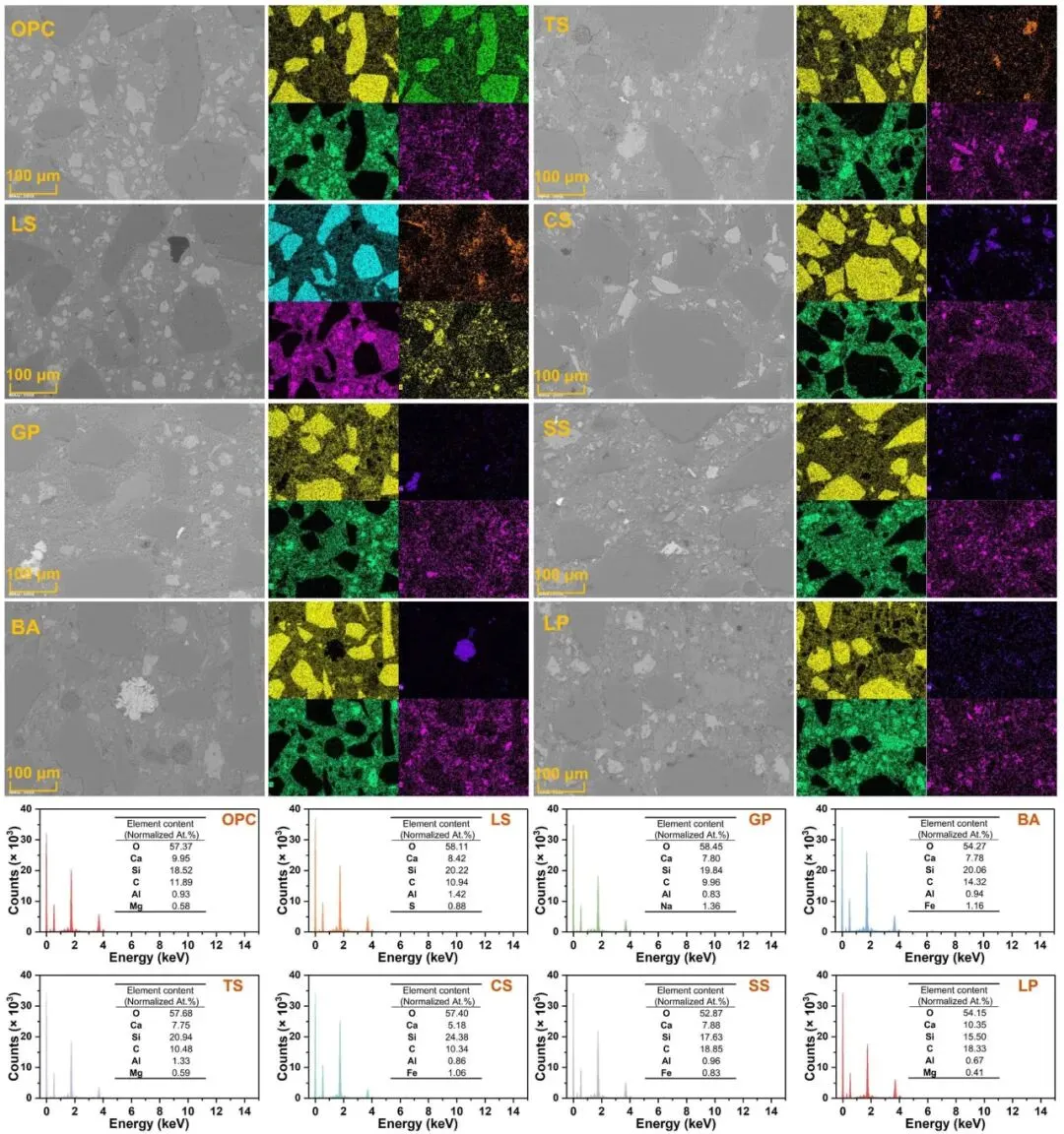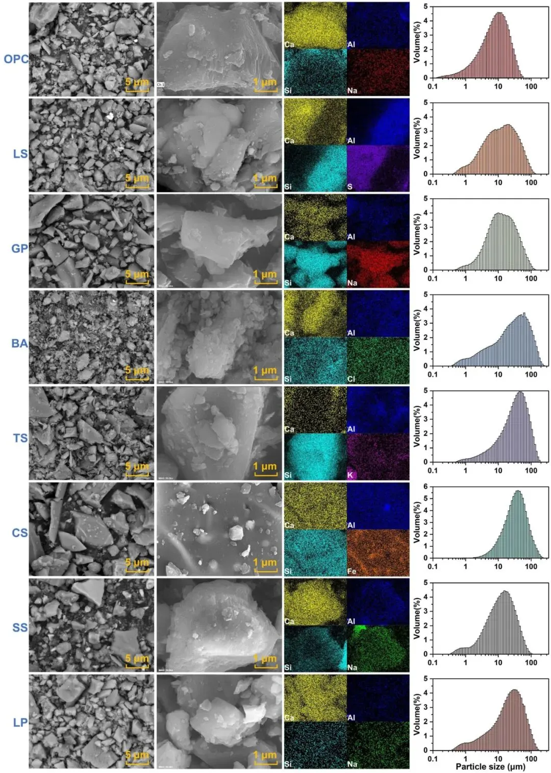 水泥材料和固体废弃物粉末的微观结构形态、元素定位及颗粒体积分布
