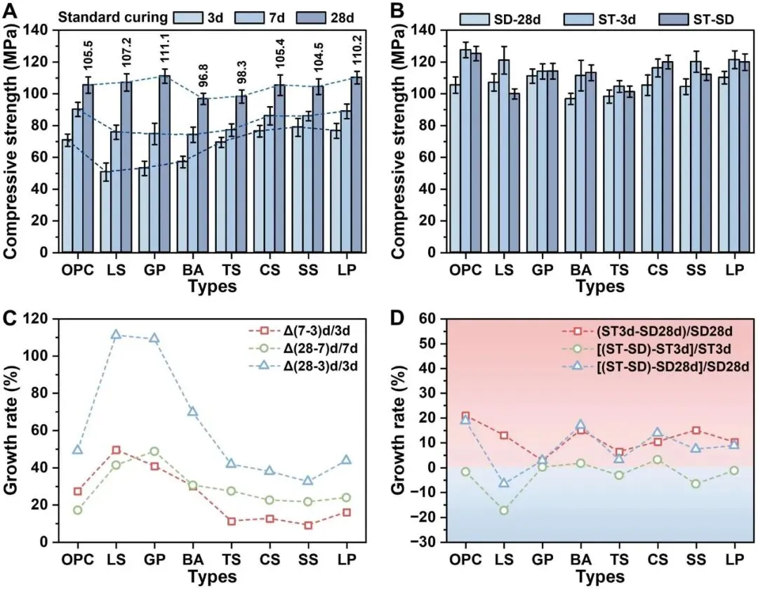 UHPC 砂浆在标准和蒸汽固化条件下,不同固体废物的抗压强度演变和生长速率响应