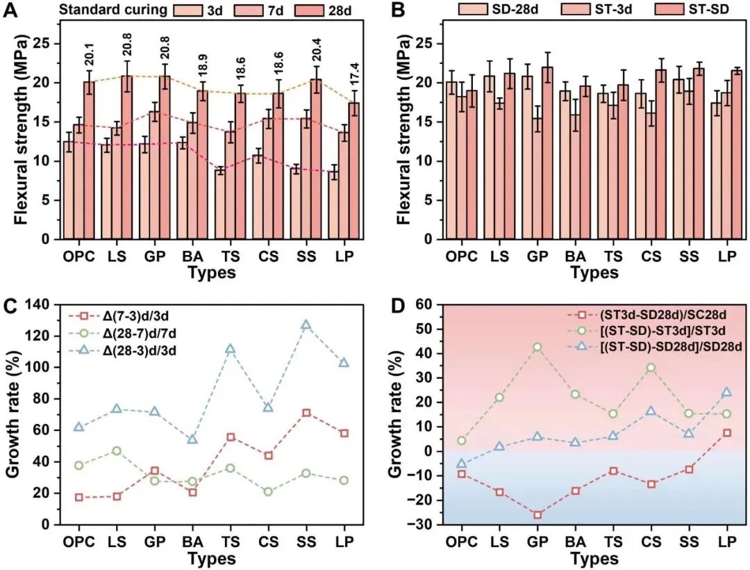 在标准和蒸汽固化条件下,不同固体废弃物的 UHPC 砂浆的抗弯强度演变和生长速率响应