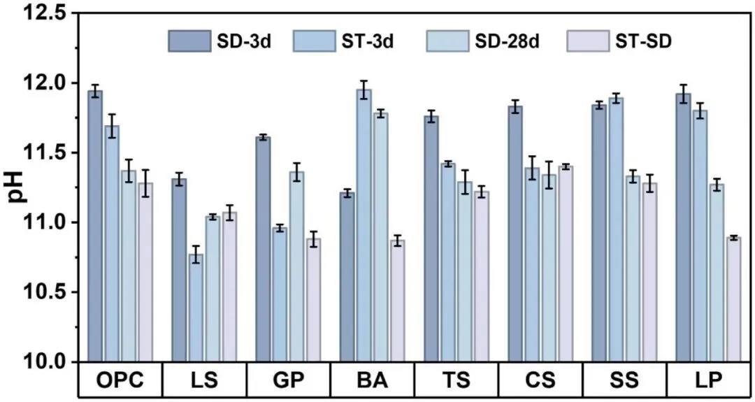 标准和蒸汽固化条件下浆糊样品孔隙溶液 pH 值的演变