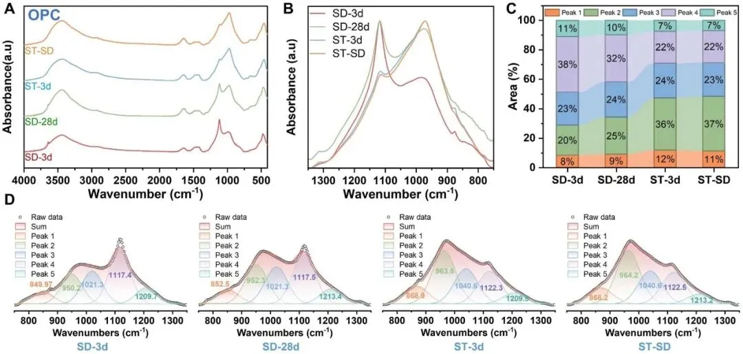 OPC 浆料在不同固化条件下的 FTIR 光谱演化及 800–1300 cm−1 区域的高斯去卷积