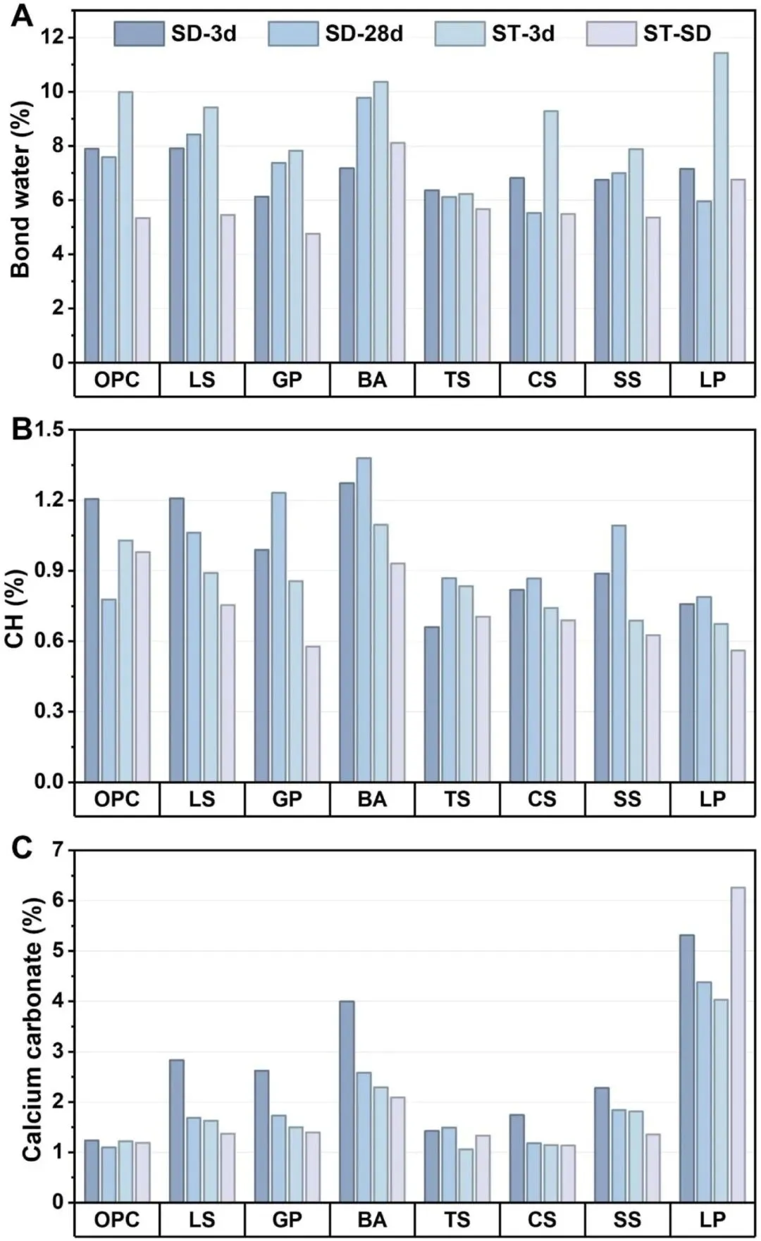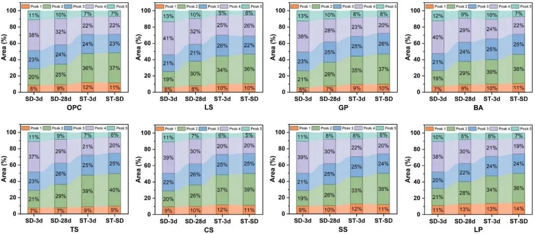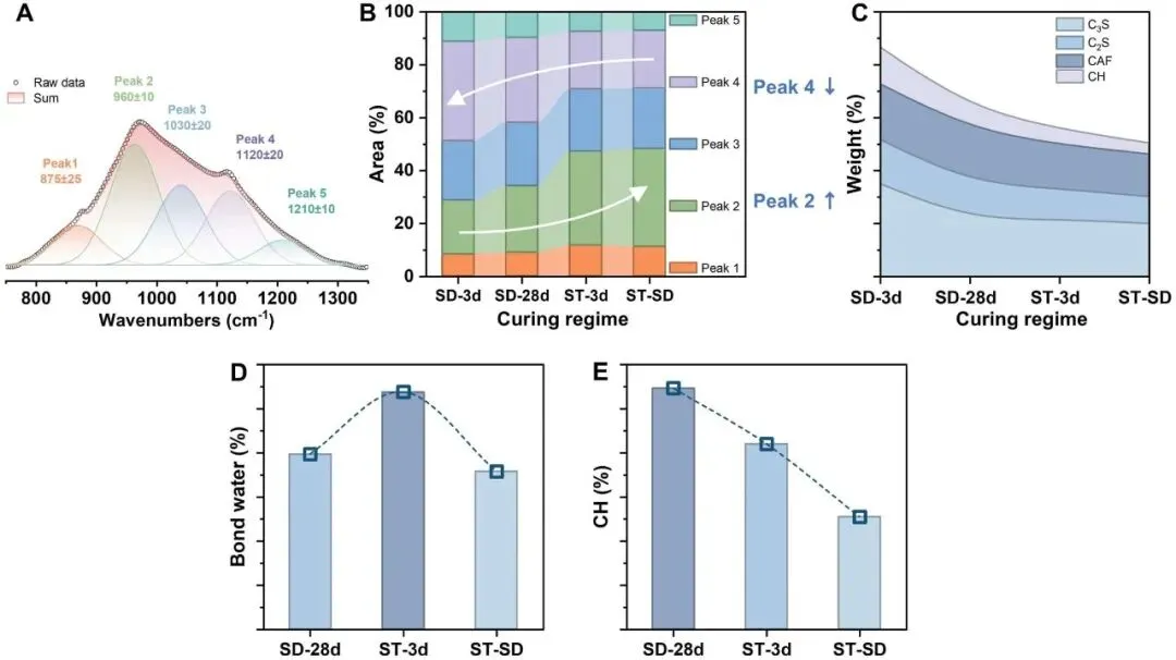 OPC 和固体废物混合 UHPC 浆料(LS、GP、BA、TS、CS、SS、LP)去卷曲 FTIR 带面积组分(800–1300 cm-1)的固化态依赖性重新分布,揭示了在蒸汽相关固化路径下向凝胶主导光谱贡献的系统转变