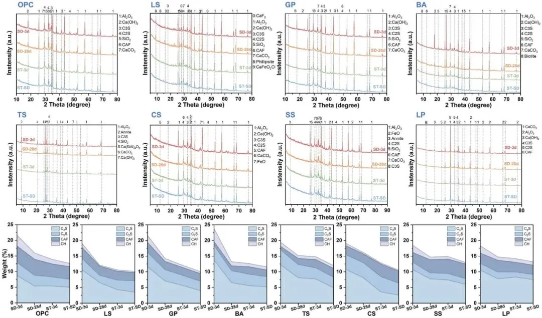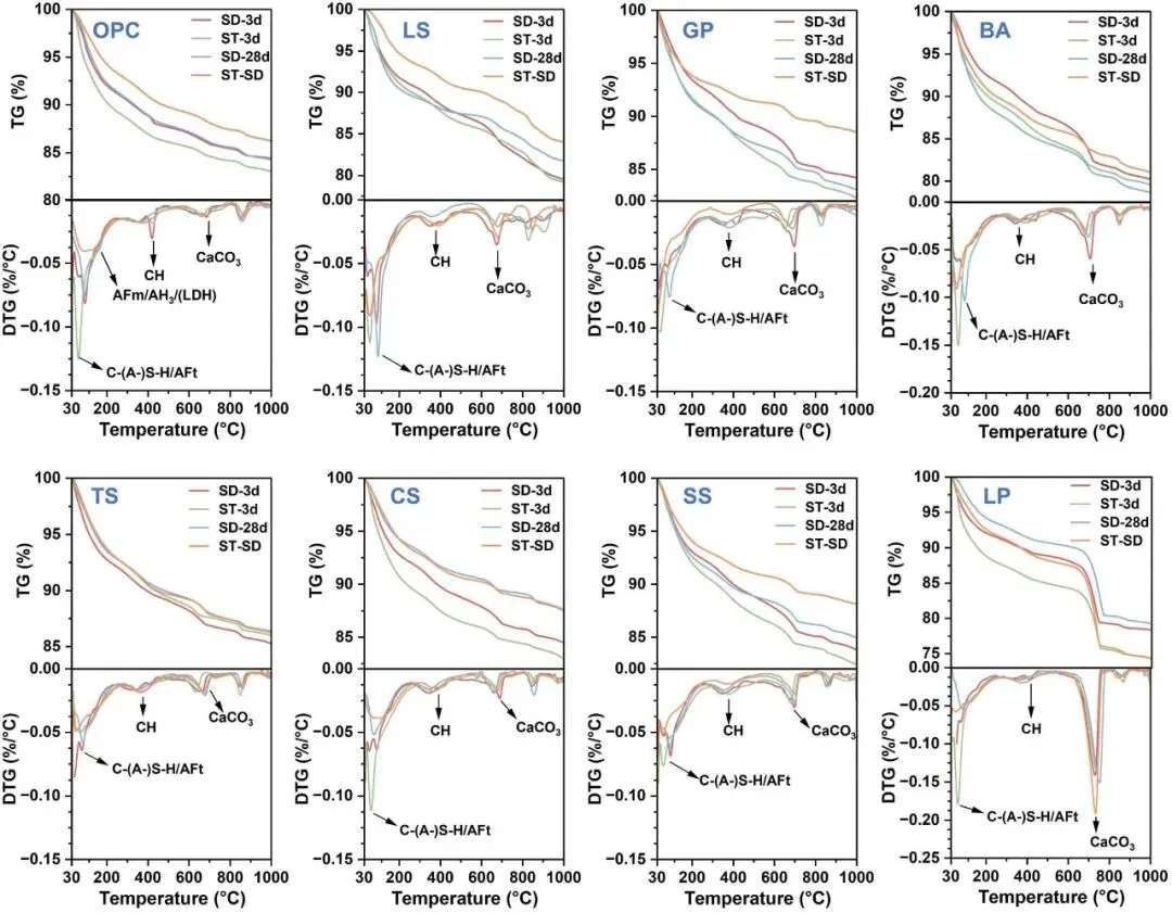 在不同固态固化条件下,利用不同固体废物在不同固态废物中的超碳酸酯浆料中进行热重(TG–DTG)分析及水化产物的定量演化