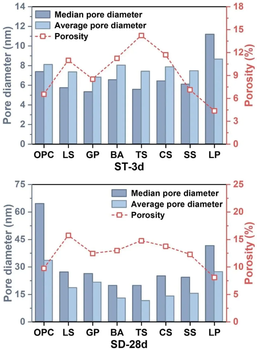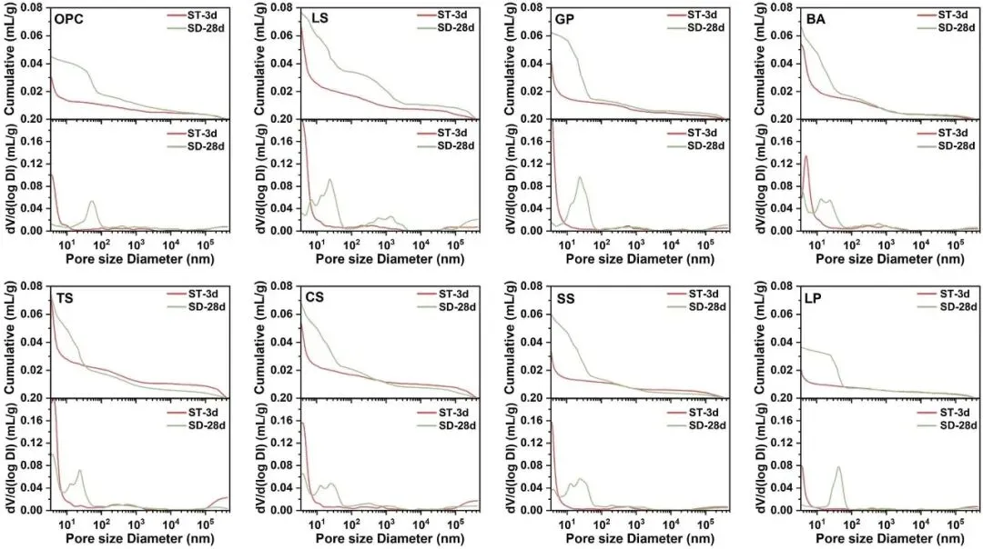 蒸汽固化(ST-3d)和标准固化(SD-28d)下浆料 MIP 表征:累积侵入曲线、孔径差异分布、分段孔分率谱以及特征孔径/孔隙度