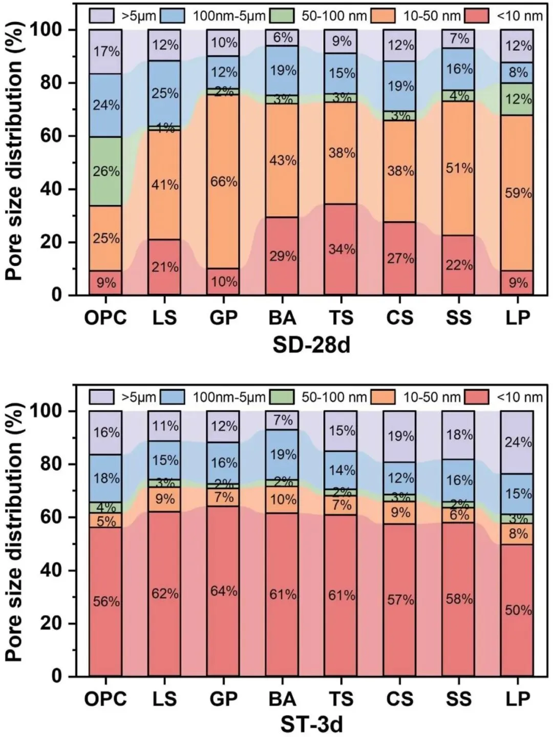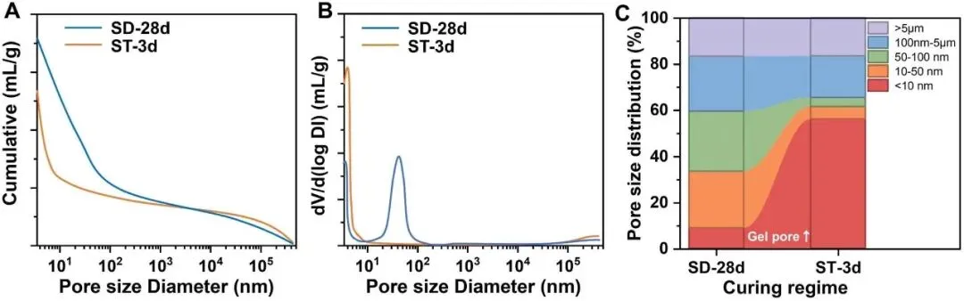 3、蒸汽养护实现孔结构范式转变;蒸汽养护可快速重构早期反应环境,推动孔网络从毛细孔主导向凝胶孔主导转变,显著提升早期强度;但早期结构一旦定型,将形成不可逆约束,限制后续结构优化空间;