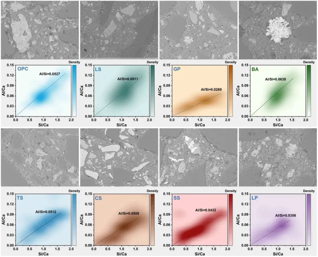 通过 EDS 点分析得出的 Si/Ca 和 Al/Ca 比值的密度分布,展示了不同系统中水合凝胶的组成特性