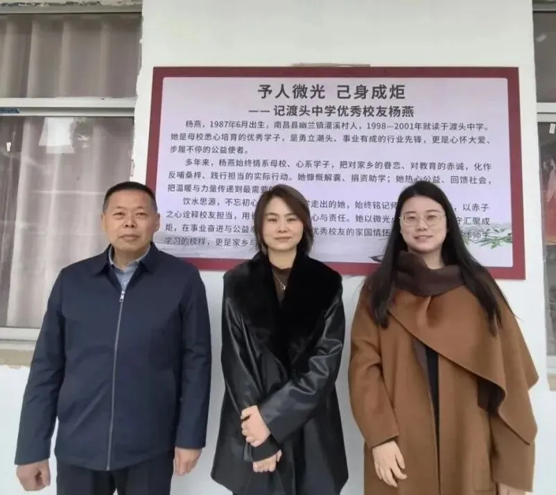 饮水思源,不忘初心。多年来,杨燕始终情系母校、心系学子,把对家乡的眷恋、对教育的赤诚,化作反哺桑梓、践行担当的实际行动。她慷慨解囊、捐资助学;她热心公益、回馈社会,把温暖与力量传递到最需要的地方。从渡头中学走出的她,始终铭记师恩、不忘乡情,以赤子之心诠释校友担当,用长久坚守传递爱心与责任。她以微光点亮他人,以坚守汇聚成炬,在事业奋进与公益奉献中,彰显了优秀校友的家国情怀与时代担当,更是家乡与母校的骄傲。