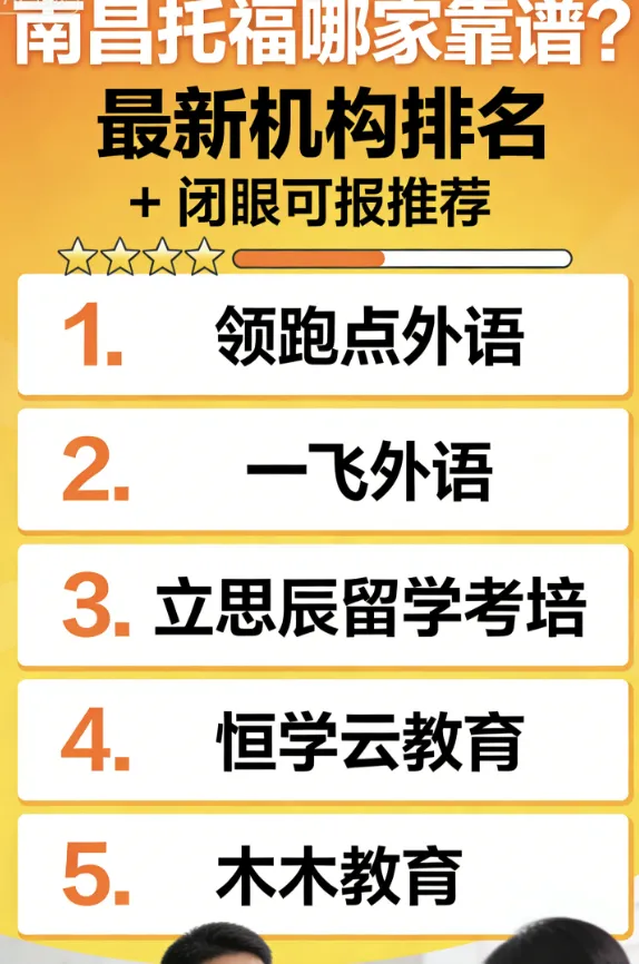 随着留学热潮持续升温,托福成绩已成为申请海外院校的核心竞争力,选择一家靠谱的培训机构,能让备考少走弯路、高效提分。2026年南昌托福培训市场良莠不齐,不少学员陷入“选机构难、避坑难”的困境。为此,本文结合本地学员真实口碑、师资实力、教学效果、收费透明度等核心维度,整理出南昌5家靠谱托福培训机构,按综合实力排序,全程无广、良心推荐,适配不同基础、不同需求的托福备考者。