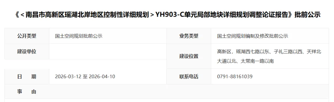 近期,南昌市自然资源和规划局发布批前公示,涉及到高新区瑶湖北岸地区YH903-C单元局部地块详细规划调整。