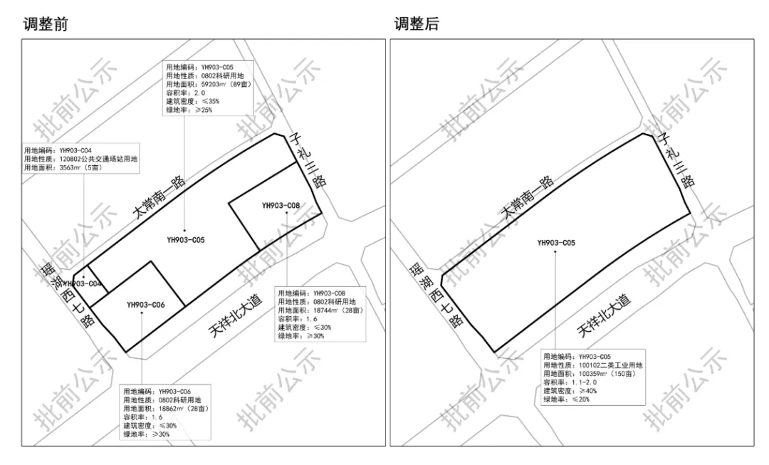 公示时间为2026年3月12日至2026年4月10日。根据公示内容,项目位置位于瑶湖西七路以东、子礼三路以西、天祥北大道以北、太常南一路以南。将原先科研用地、公共交通场站用地调整为二类工业用地,调整之后的地块用地编码为YH903-C05,用地面积100359㎡(150亩),容积率1.1-2.0,建筑密度≥40%,绿地率≤20%。从地块现状来看,周边目前分布有多家医药相关企业,产业聚集效应显著,从此次的调整可以看出,地块未来或迎来大型产业项目。免责说明丨文章图片来源于网络,如有侵权,请后台联系,内容仅供读者参考,若实际信息与宣传内容有出入,请以官方实际信息为准。