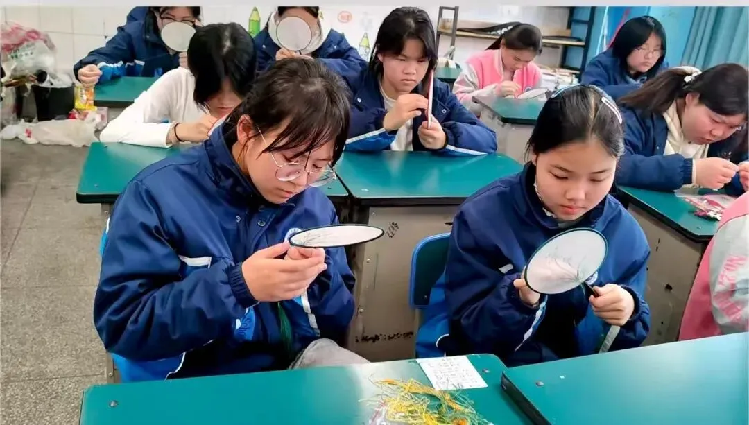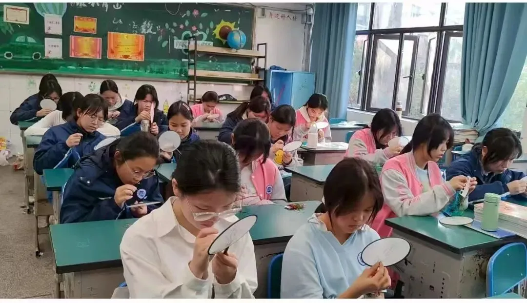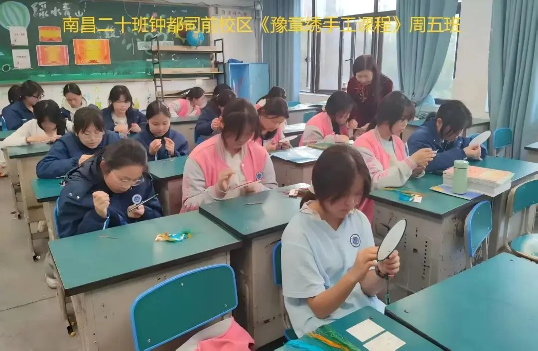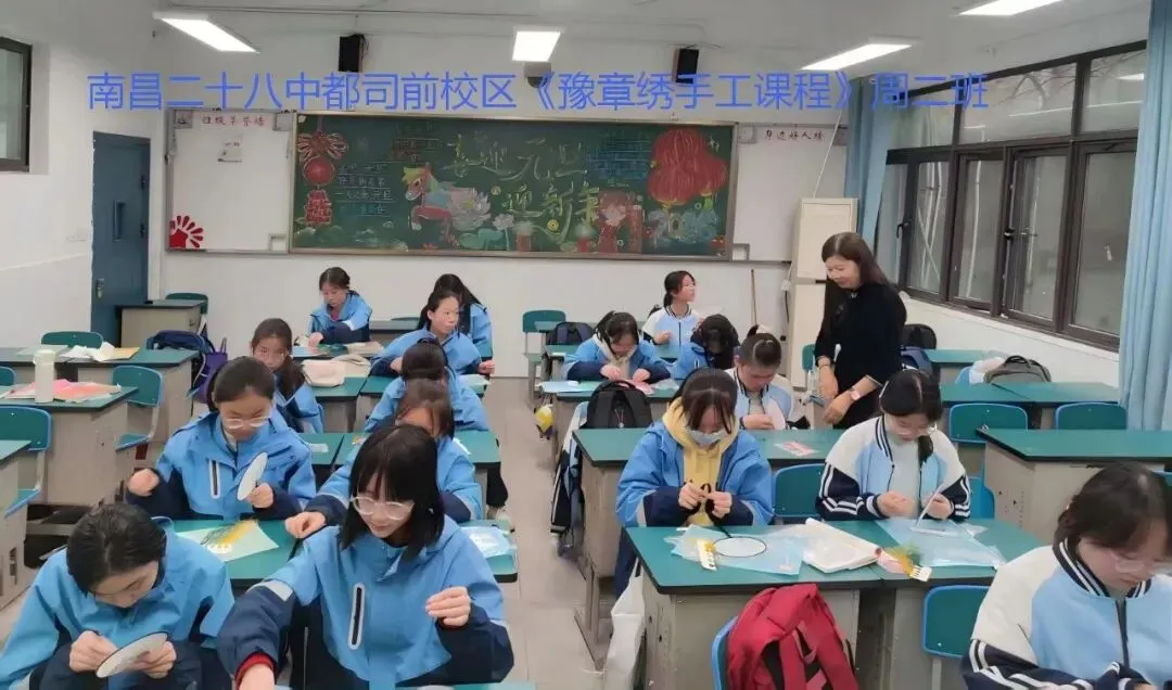 2026年3月17日(周二)和3月13日(周五)下午,南昌市第二十八中都司前校区周二班与周五班的学生们,在豫章绣第十代传承人李小玲的带领下,依据第八代传承人余正连与周南英共同编写的专属教材及配套刺绣材料包开展教学活动,每周二、周五下午与同学们相约于指尖上的时光。本学期的《豫章绣手工课程》中,有部分学生是延续上学期的课程继续学习,另一部分则是从零起步,逐步掌握了豫章绣的基本技艺。在本学期的手工刺绣课程教学中,我们以循序渐进的教学体系为支撑,从基础针法入手,逐步引导学生深入探索刺绣艺术的魅力。在李小玲老师的精心指导下,学生们能独立完成一把扇子和一个书签的精美作品,我们期待着这些作品的最终呈现。