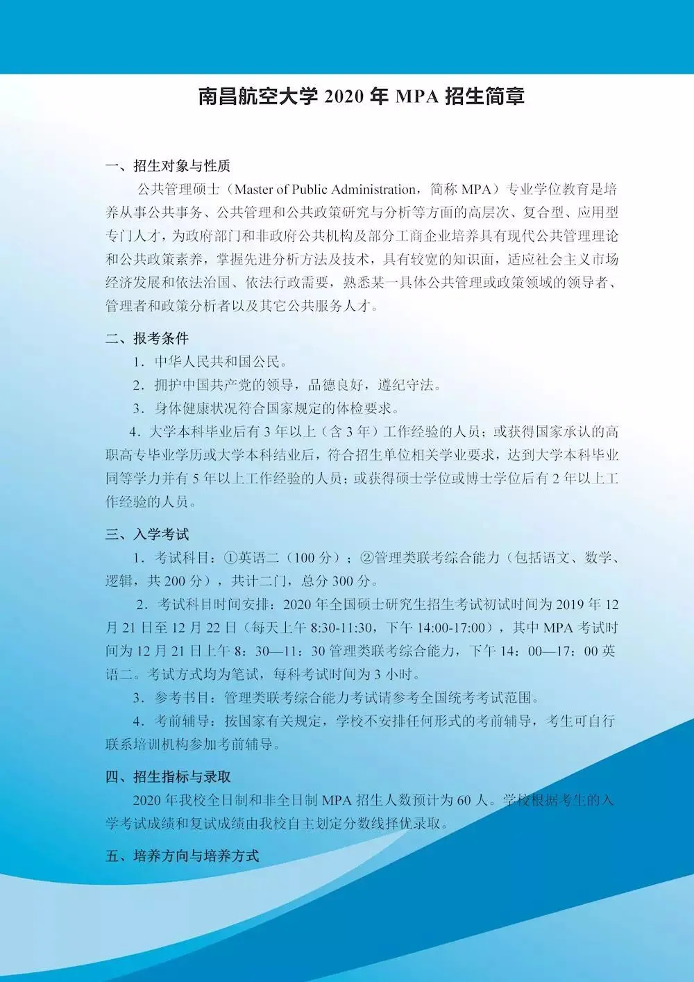 2020年我校全日制和非全日制MPA招生人数预计为60人。学校根据考生的入学考试成绩和复试成绩由我校自主划定分数线择优录取。