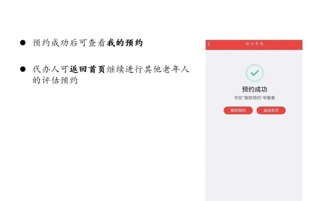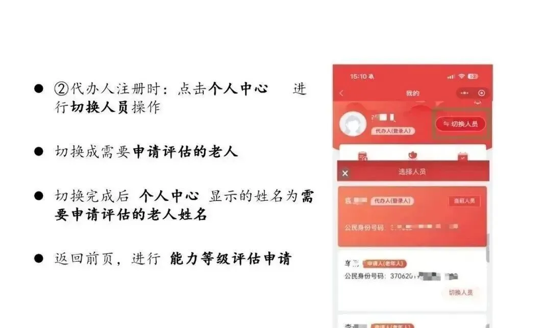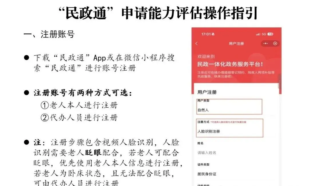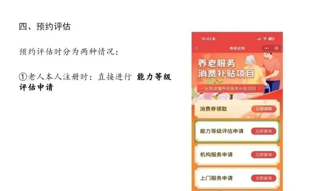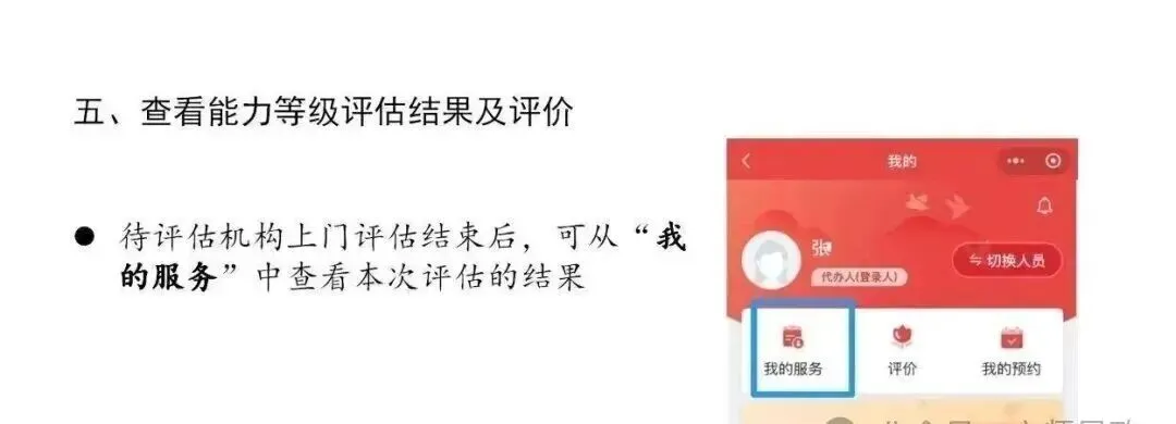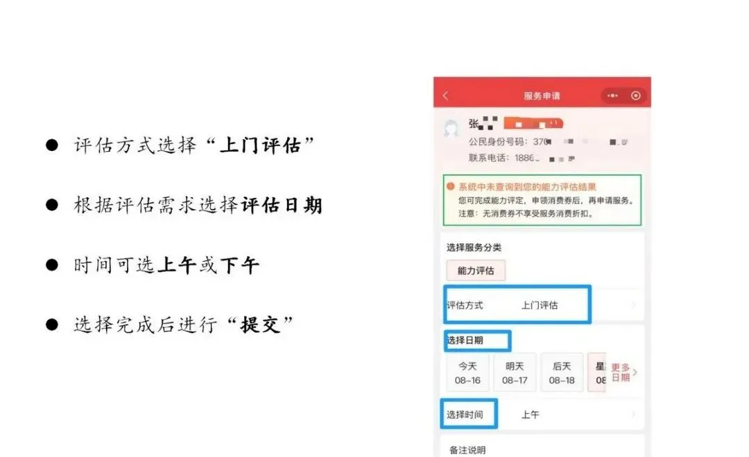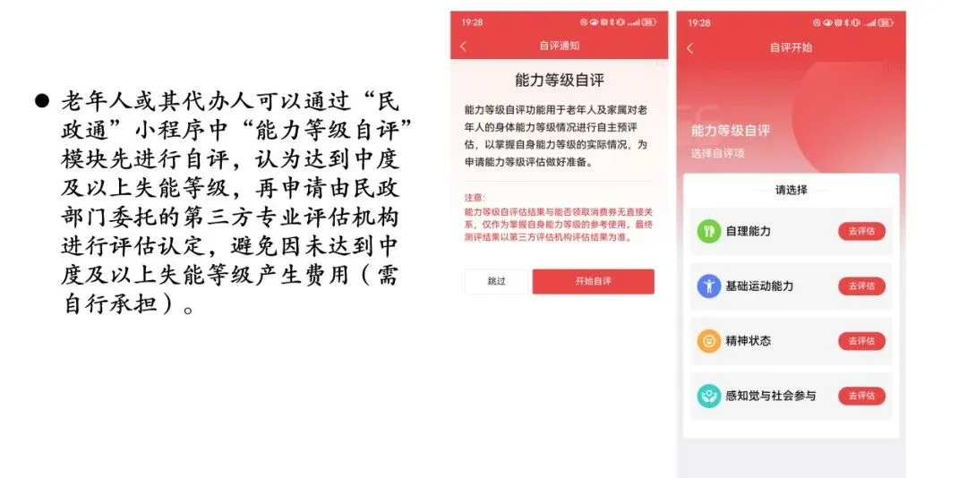 重要提示:1.老年人或其代办人在申请第三方专业机构评估之前,建议在“民政通”小程序“能力等级评估申请”模块中选择“能力等级自评”,避免因不符合条件而产生费用(如果申请专业评估,评估结果是轻度失能或能力完好,所产生的费用需个人支付)。老年人也可在家对是否具备自主吃饭、穿衣、上下床、如厕、室内行走、洗澡能力6项指标开展自测,4-6项指标不能达到的,为失能;1-2项指标不能达到的,为轻度失能;3-4项指标不能达到的,为中度失能;5-6项指标不能达到的,为重度失能。