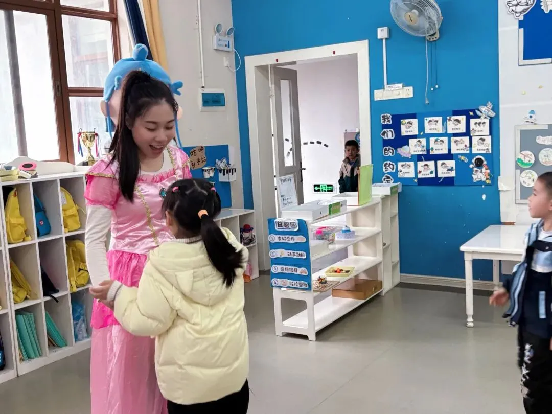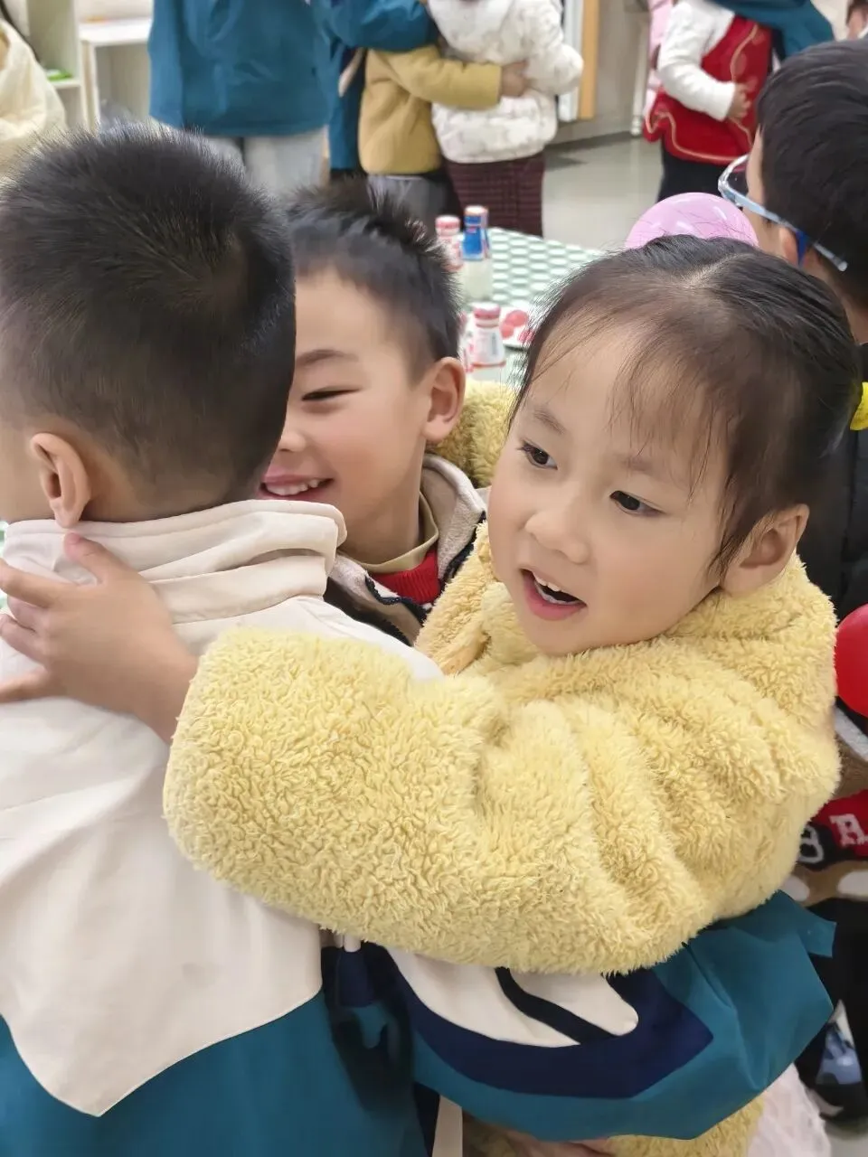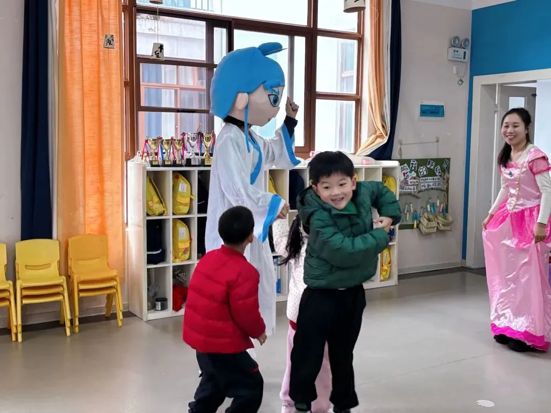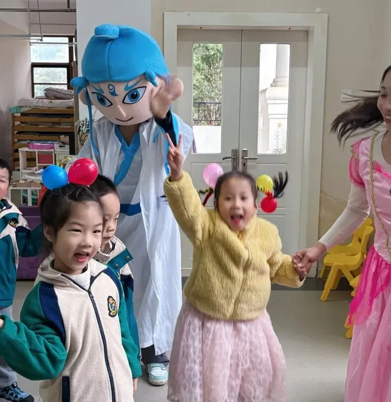老师们穿上可爱的玩偶服,化身孩子们熟悉的卡通人物,悄悄走进各个班级。当玩偶们出现在教室门口时,孩子们的眼睛瞬间亮了起来!玩偶们来到三月份生日的小朋友身边,热情地拥抱他们,牵起他们的小手,带着满满的仪式感,将小寿星们一路护送到精心布置的生日会场地。
