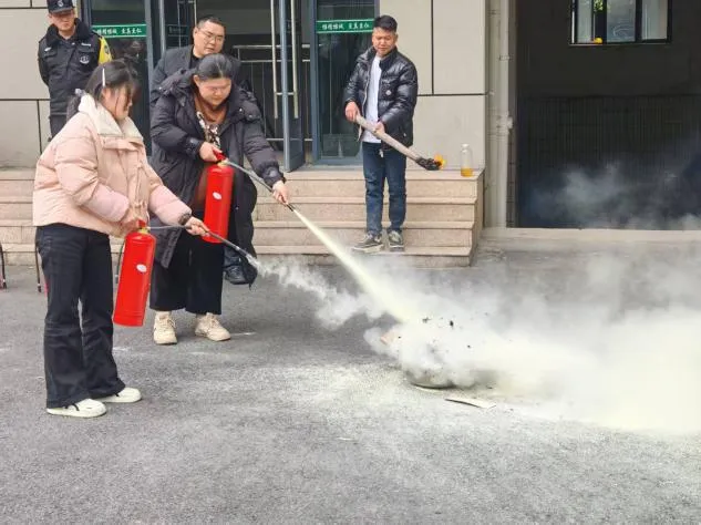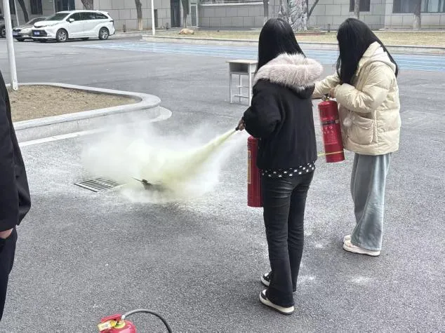 演练前,工作人员结合校园火灾特点,围绕火灾报警流程、火场疏散技巧、灭火器及消防栓使用方法、宿舍用电用火安全等内容进行细致讲解,重点强调了火灾初期处置要点和逃生注意事项。随着模拟火情警报响起,参训人员迅速按照预定路线,弯腰低姿、用衣物捂住口鼻,有序撤离至安全区域,整个疏散过程紧张有序、衔接顺畅。随后,在工作人员的指导下,大家依次实操灭火器,对准“火源”根部喷射,亲身体验灭火操作,进一步巩固了消防技能。