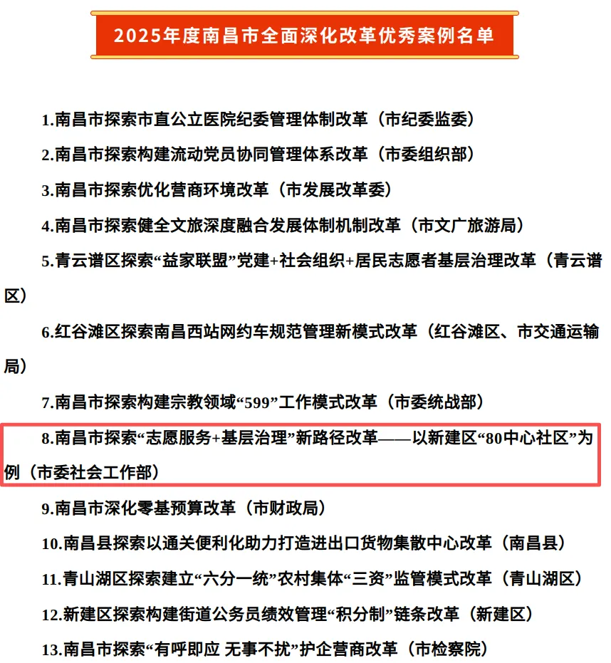 3月18日,2025年度南昌市全面深化改革优秀案例名单揭晓。我部与新建区共同指导的社会工作案例——南昌市探索“志愿服务+基层治理”新路径改革——以新建区“80中心社区”为例,入选“2025年度南昌市全面深化改革优秀案例”。