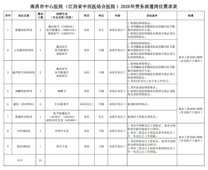 声明:本微信公众号刊载此文,无任何商业目的,目的是架起求职者和用人单位之间的桥梁,传递更多的招聘就业信息,请您找工作时候务必高度警惕各类求职陷阱。若来源标注错误或侵犯了您的合法权益,请及时与我们联系,我们将及时更正、删除或依法处理,微信号(含:商务合作):sqdzry。南昌市中心医院八一大道老福山院区(江西省中西医结合医院、南昌市公共卫生医学中心、江西中医药大学第四附属医院)始建1950年,总院位于南昌市区中心的八一大道起点、老福山畔,是国家首批三级甲等中西医结合医院、全国首批重点中西医结合医院、中西医协同“旗舰”医院试点项目建设单位、国家首批中医住院医师和中医类别全科医生规范化培养基地。开放床位872张,设临床、医技科室43个。医院以“微创腔镜技术和中西医结合特色”两大优势技术学科群为龙头,突出中医药特色、探寻中西医融合、医教研协同发展,打造高水平的智慧型、创新型和研究型中西医结合医疗中心。正在建设中的瑶湖院区位于南昌市高新区麻丘镇,占地约158.8亩,设置床位1330张。因医院的业务发展以及瑶湖院区运行需要,需面向社会公开招聘16名劳务派遣制工作人员。
