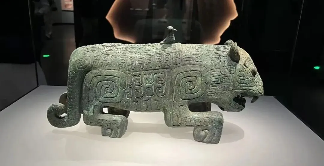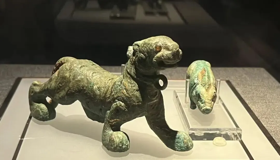 其中有件著名文物叫作伏鸟双尾青铜虎。虎很大,是当地图腾,鸟很小,却站在虎背上,令人一见就想起“马踏飞燕”,然后想到“天命玄鸟,降而生商”。但这是我瞎想,“马踏飞燕“已改名铜奔马,“飞燕”是否指匈奴有待商榷,这只小鸟更没说指代商,《国家宝藏》说虎和鸟是兄弟俩。