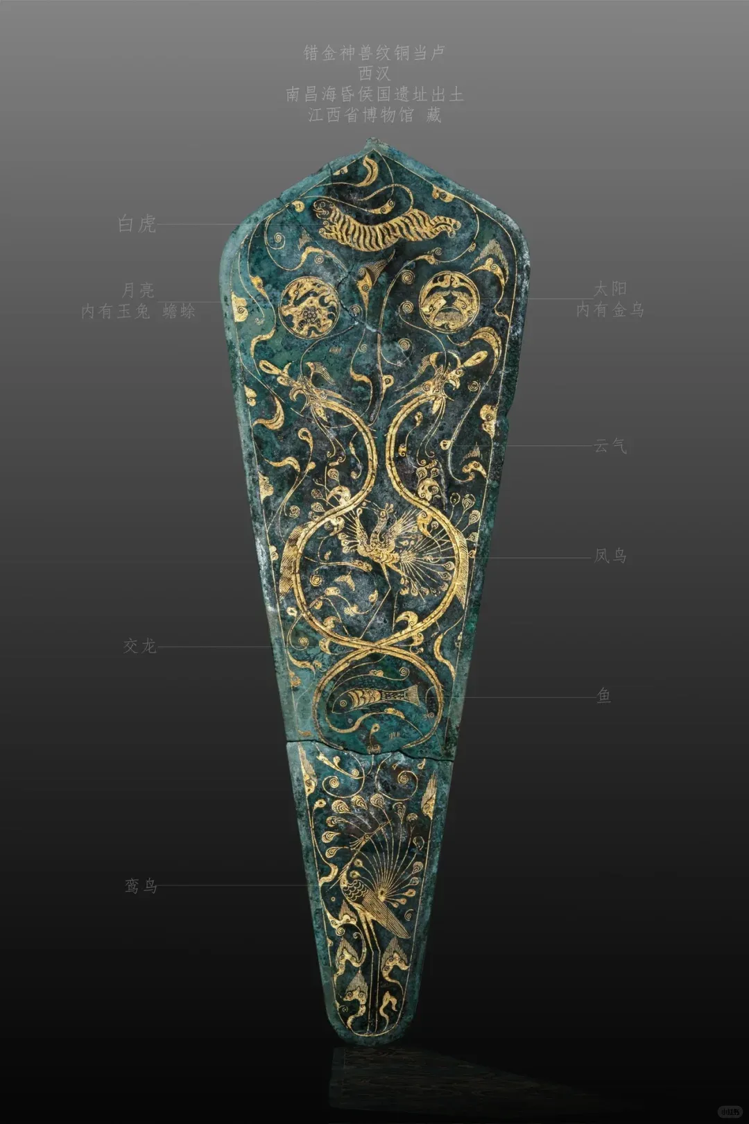 第四个看了很久的,是陪葬马匹的当卢,就是覆盖马额头的三角形片状物,相当于马的头巾。青铜制,错金银工艺,雕刻无比精致,有日月、云气、交缠的龙、衔珠的凤、跳舞的鸾以及虎、鱼、羽人等,每样东西都具象得可爱且优美,是人类当人不久才能保存的想象力。