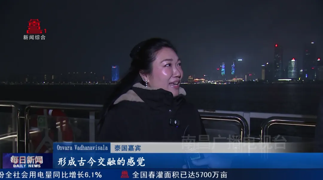 当晚,嘉宾们从秋水广场客运停靠点登上游轮。江风拂面,嘉宾们在游轮甲板上凭栏远眺。对岸,飞檐翘角的滕王阁在暖黄色泛光灯下古韵盎然;身后,红谷滩区高楼林立,正以光影变幻诉说着城市的生长速度。千年文脉与现代都市隔水相望、交相辉映,完成了一场一江两岸的“古今对话”。