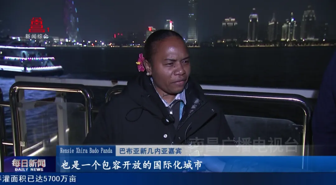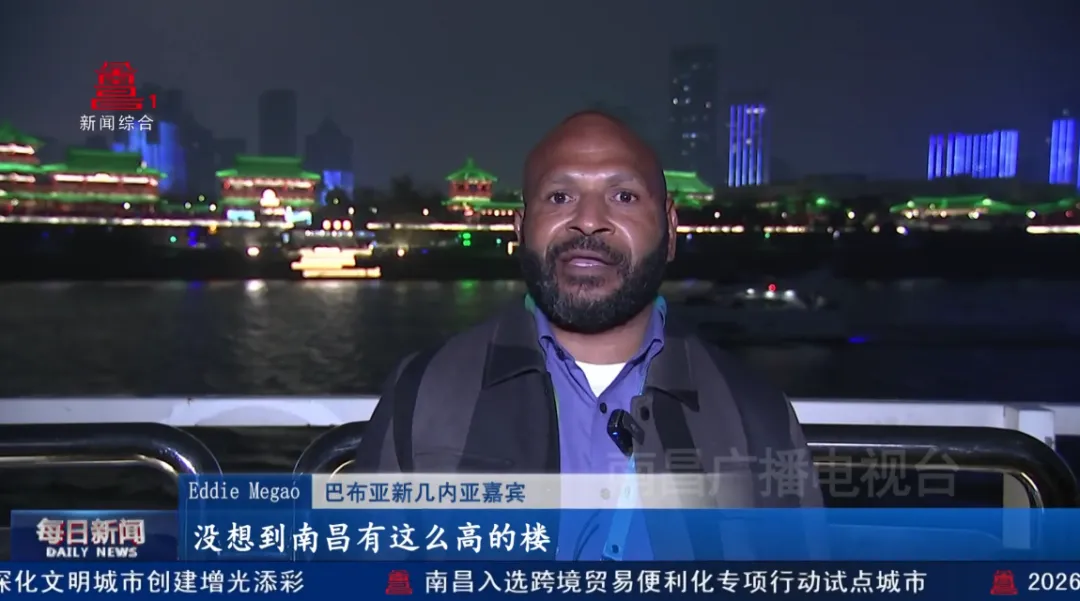 巴布亚新几内亚嘉宾Eddie Megao;“这是我第一次来南昌,没想到南昌有这么高的楼,这么多的现代建筑,有这么美的景色,这是一个很惊喜的体验。我去过很多地方看灯光秀,我发现南昌的灯光秀,所有建筑上灯是整体联动的,我也很好奇,这是怎么做到的。这是我最特别的感受。”